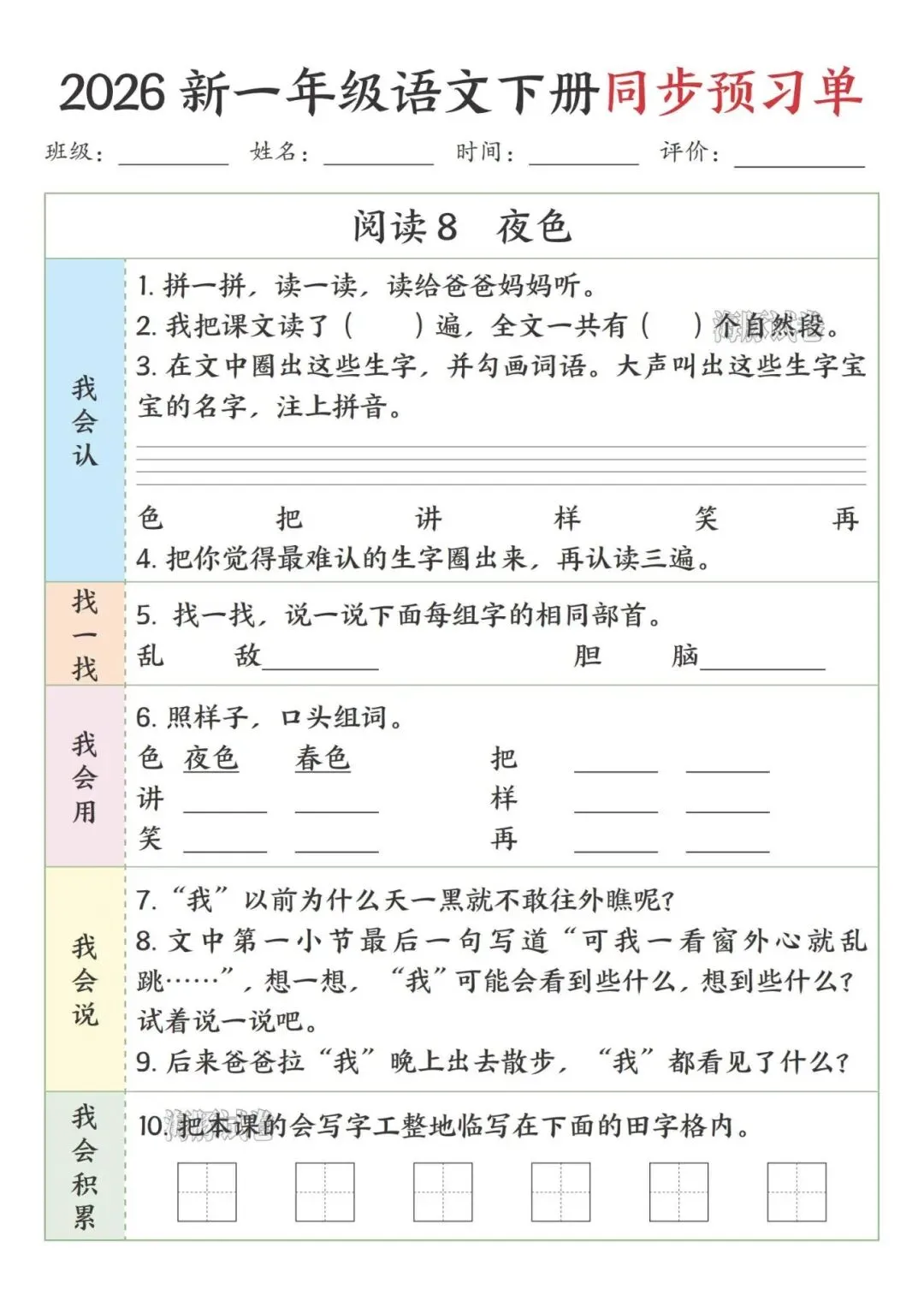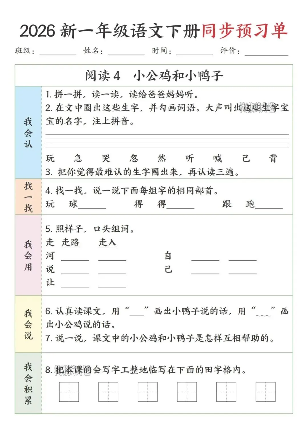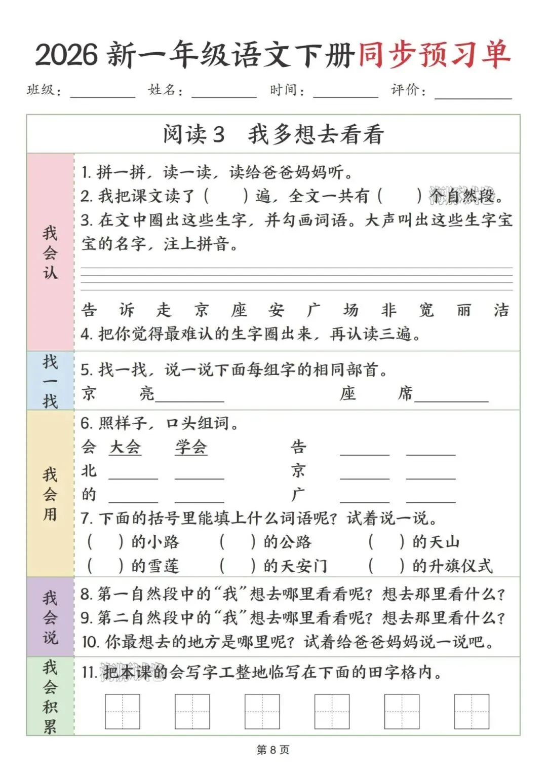 这份一年级下册语文预习单完全贴合课本课文顺序,按识字、阅读、语文园地依次编排,特别适合课前预习。每课都分了我会认、找一找、我会用等板块,步骤简单清晰,低年级孩子能跟着一步步做,还侧重亲子互动,让家长轻松辅导。既抓生字、部首、组词这些基础,又有口头表达、书写积累的练习,能全方位帮孩子打牢语文基础,预习起来特别顺手。