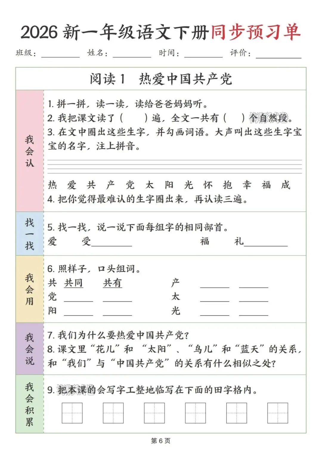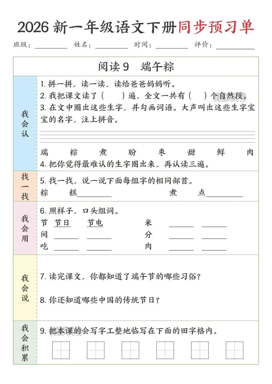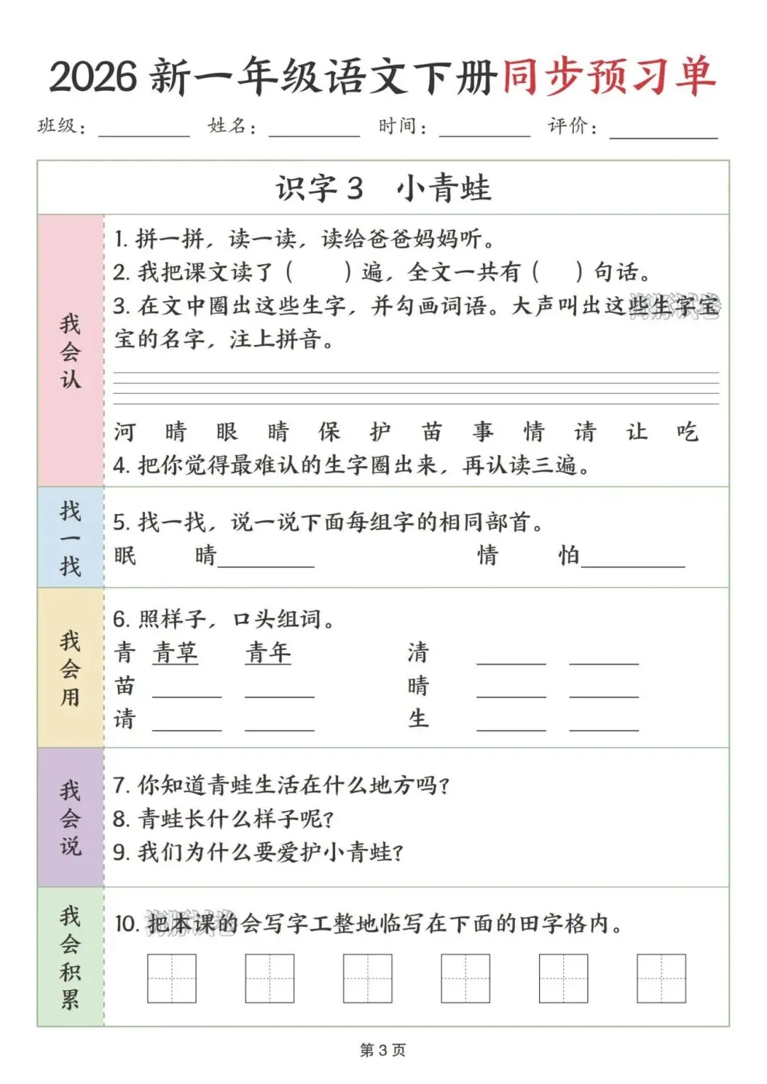 这份一年级下册语文预习单完全贴合课本课文顺序,按识字、阅读、语文园地依次编排,特别适合课前预习。每课都分了我会认、找一找、我会用等板块,步骤简单清晰,低年级孩子能跟着一步步做,还侧重亲子互动,让家长轻松辅导。既抓生字、部首、组词这些基础,又有口头表达、书写积累的练习,能全方位帮孩子打牢语文基础,预习起来特别顺手。