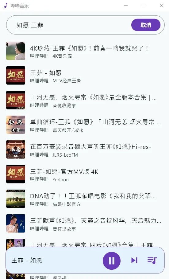 Windows端和手机端基本一样,通过简洁的界面,用户可以轻松地进行歌曲搜索。只需在搜索栏输入歌曲名称并按下回车键,系统就会展示搜索结果。