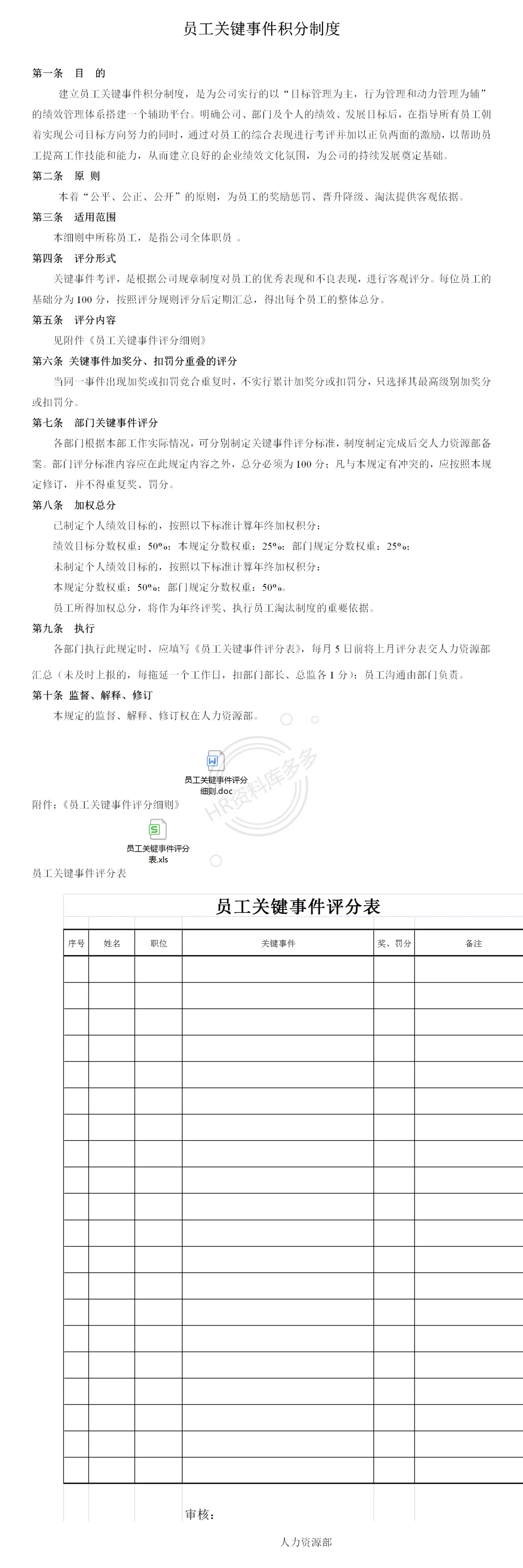 配套文件:包含《员工关键事件评分细则》(规定具体评分内容)和《员工关键事件评分表》(记录序号、姓名、职位、关键事件、奖罚分、备注及审核信息)。
