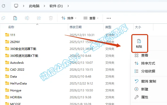 3.打开D盘,在空白处,鼠标右键【粘贴】刚才复制的文件