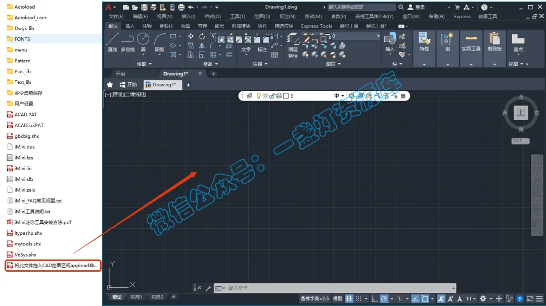 6.打开D盘【粘贴】的【Mini】文件夹,将【将此文件拖入CAD绘图区或appload命令加载安装.lsp】文件拖动到打开的CAD软件使用界面中