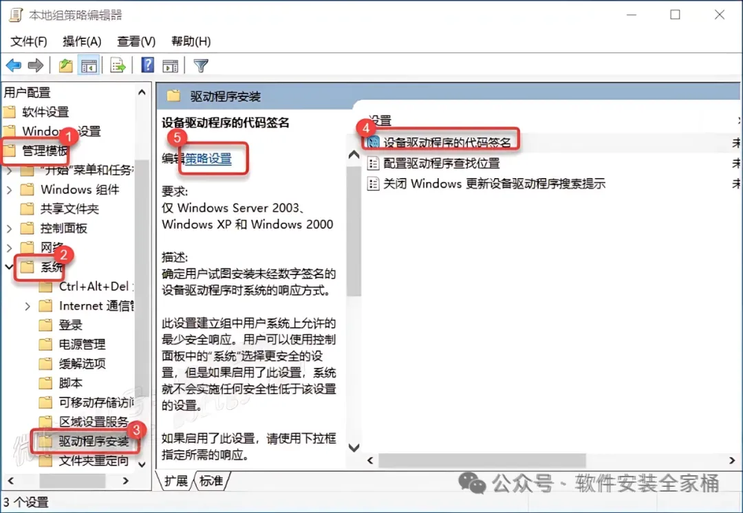 ❸.①点击【管理模板】,②点击【系统】,③点击【驱动程序安装】,④点击【设备驱动程序的代码签名】,⑤点击【策略设置】。