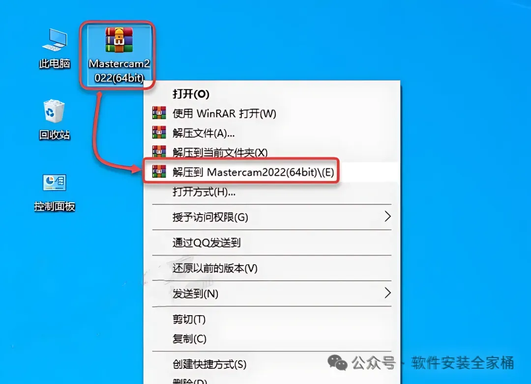 1.鼠标右击【Mastercam2022(64bit)】压缩包(win11及以上系统需先点击“显示更多选项”)选择【解压到Mastercam2022(64bit)】。