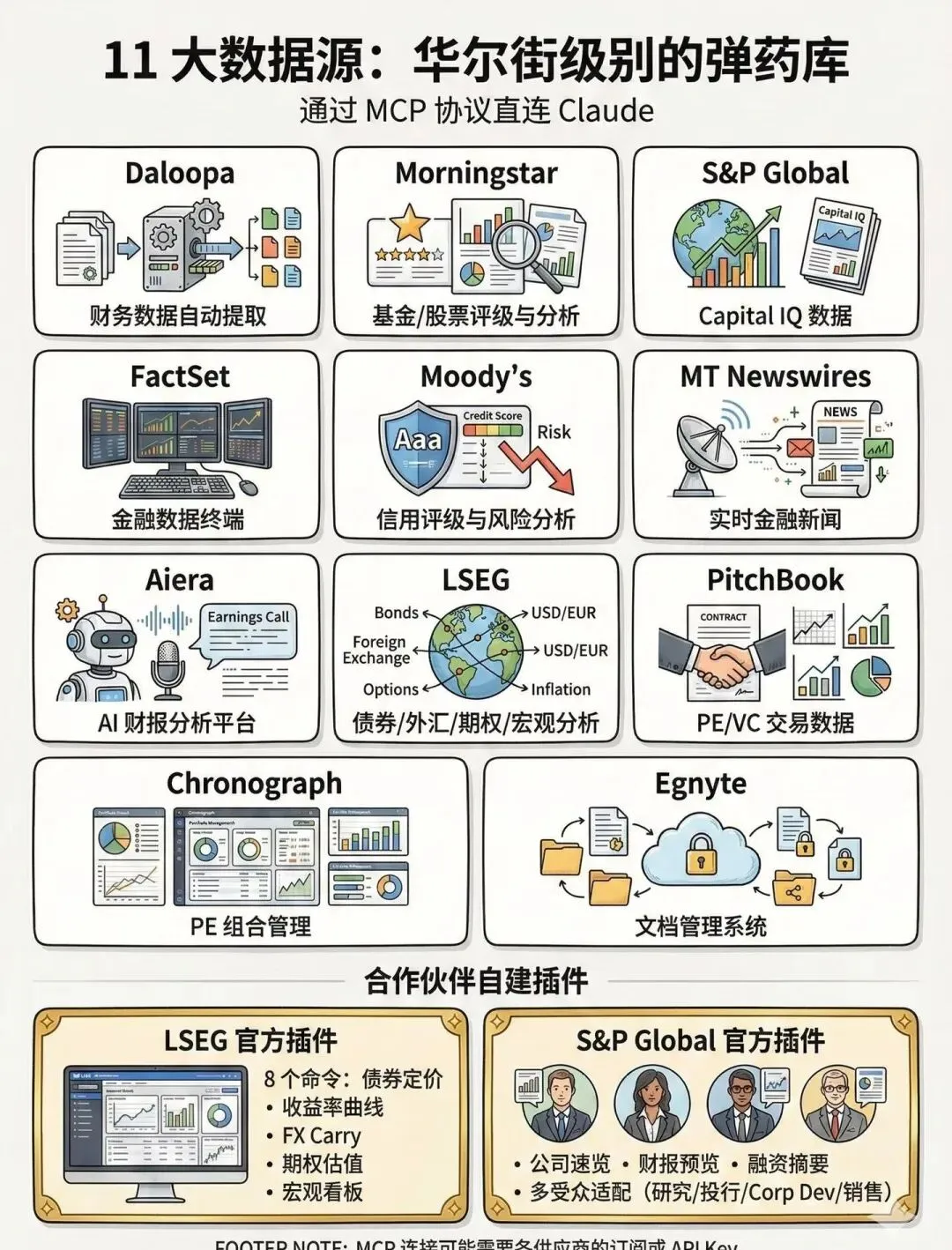 这里必须说一句,Claude插件不是来取代传统金融数据商的,而是通过MCP协议和标普、晨星这些大佬深度合作,搞出“Anthropic订阅费+数据服务商API费用”的双层计费模式,实现生态共赢。消息一出来,汤森路透单日涨11.4%,FactSet涨近6%,市场直接用脚投票,从“担心AI削弱数据商粘性”,变成“认可AI提升数据商使用频率”,这就是合作的价值!而且晨星作为全球增长最快的指数提供商,已经推出2.5万+条指数,跟踪资产2210亿美元,和Claude直连后,插件的基金数据更丰富,财富管理、股票研究场景的专业度直接拉满。