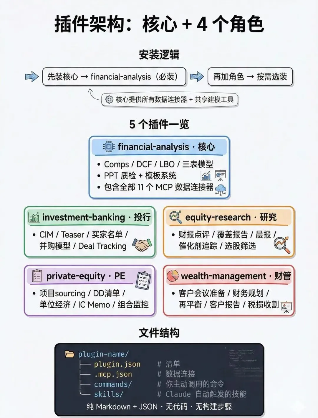这套插件主打一个“核心+角色”的配置,总共5个专业插件,覆盖金融五大核心领域,再加上41个专业技能、38个可直接调用的命令、11个MCP数据源连接器,不管是基础财务建模,还是复杂交易处理,都能找到对应工具,精准匹配不同金融人的岗位需求,不用多装冗余功能,主打一个高效适配!