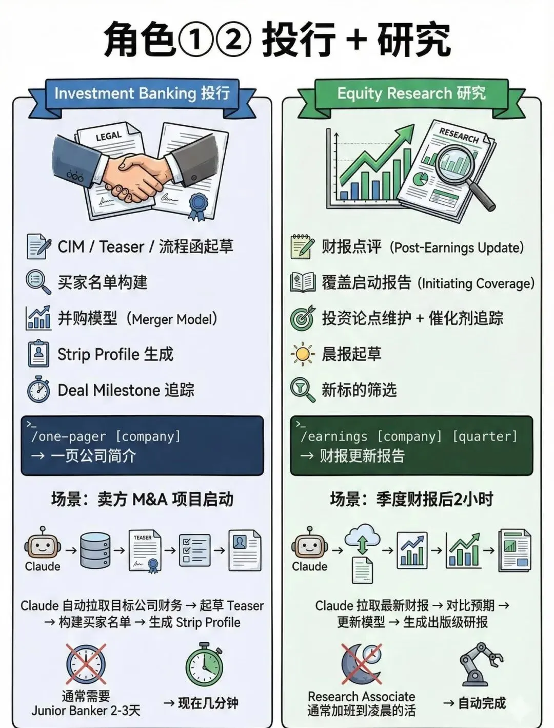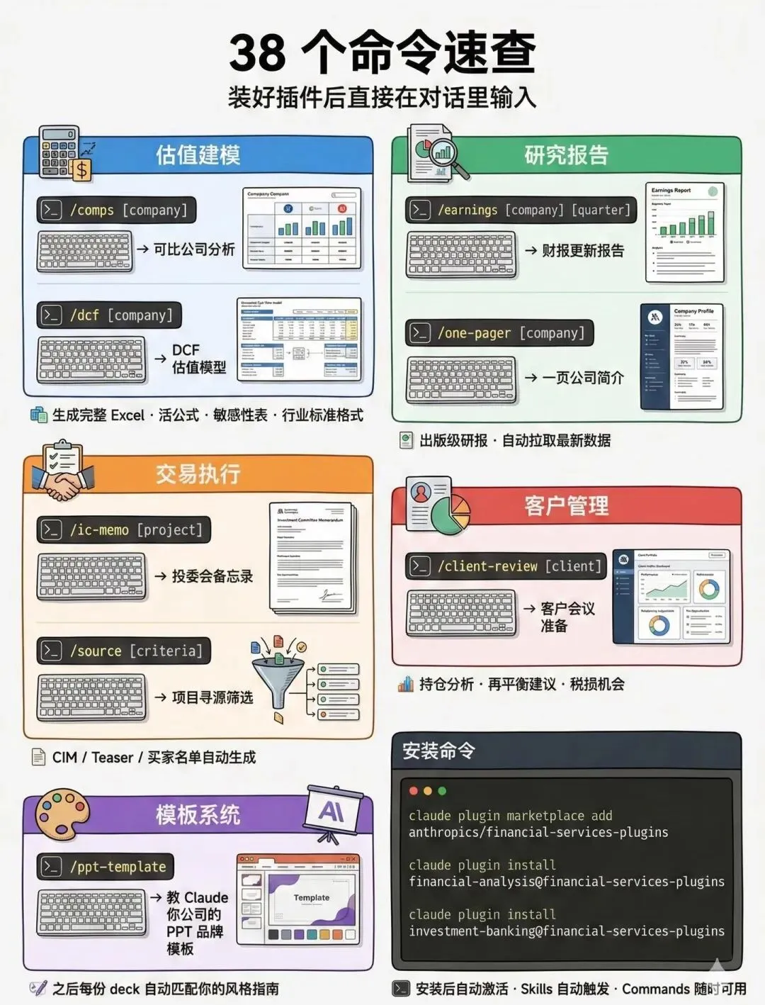 如果说插件是“工具包”,那这五条完整工作流,就是“懒人说明书”,真正实现“输入指令,直接出成果”,彻底告别传统金融分析“数据搬运+手动建模+反复修改”的内耗模式!据行业测算,用它能让金融分析效率提升80%、成本降低60%,分析师直接解放双手,摆脱重复劳动。每条工作流都遵循“数据源直连→Claude智能处理→成果输出”的逻辑,全程无需人工干预,直接对接Excel、PPT、Word,无缝协同,体验拉满!