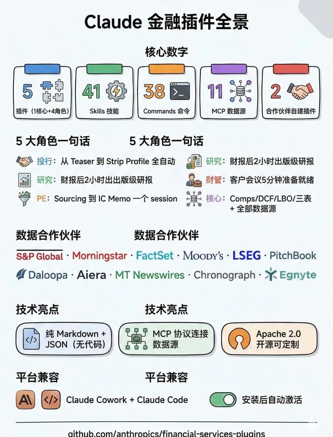 Anthropic最近直接在GitHub开源了一套金融服务插件——financial-services-plugins,直接打破AI和专业金融分析的壁垒,普通人靠Claude,分分钟就能拥有投行、证券研究、PE、财富管理的专业分析能力!和那些第三方插件不一样,这可是Anthropic官方出品,权威性、兼容性直接拉满,更绝的是,S&P Global(标普全球)、Morningstar(晨星)、FactSet、Moody’s(穆迪)这些华尔街顶流数据商,全靠MCP协议直连,意味着Claude能直接调用全球最核心、最实时的金融数据,无需手动筛选录入,大幅节省时间!