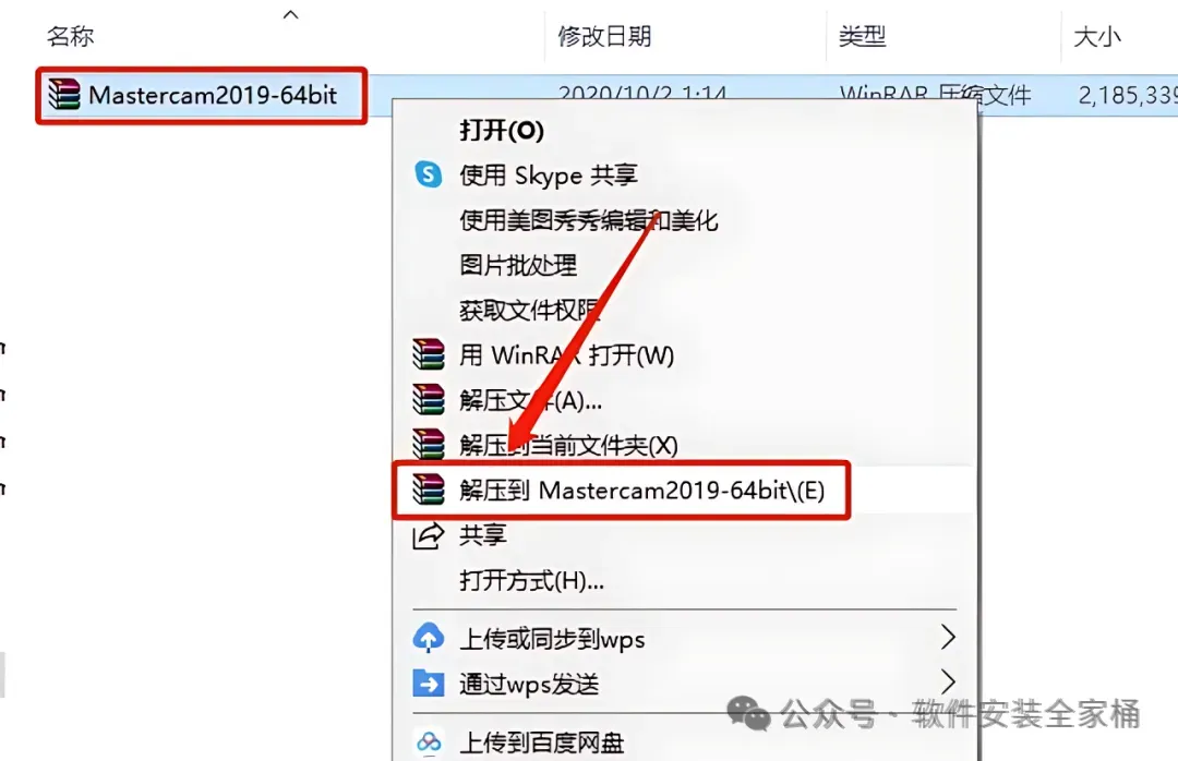 1.打开下载的Mastercam 2019软件安装包,鼠标右击压缩包选择【解压到Mastercam 2019】。