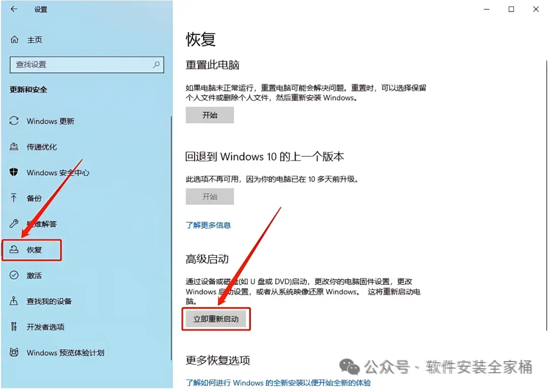 19.点击【恢复】,然后点击【立即重新启动】,之后电脑会关机重启。