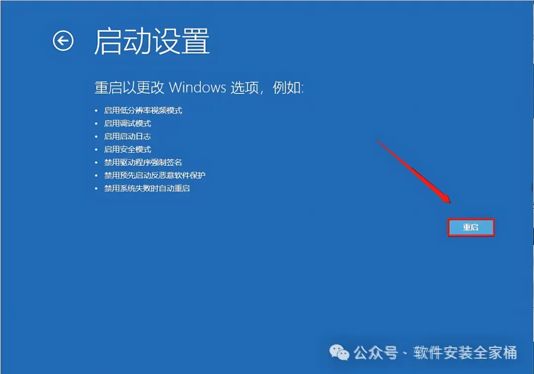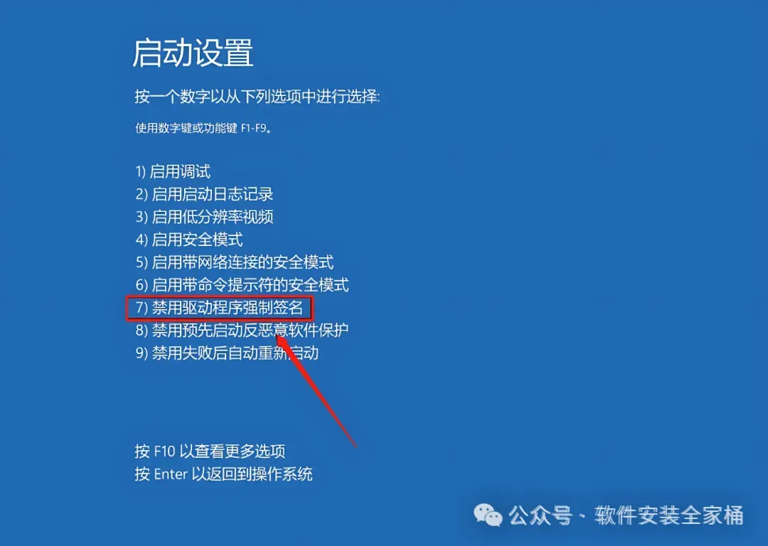 24.重启后自动进入到下图所示的界面,找到【禁用驱动程序强制签名】选项,然后根据前面对应的数字按键盘上的F1-F9键,教程中对应的是7,所以直接按F7键,之后电脑会再次重启。