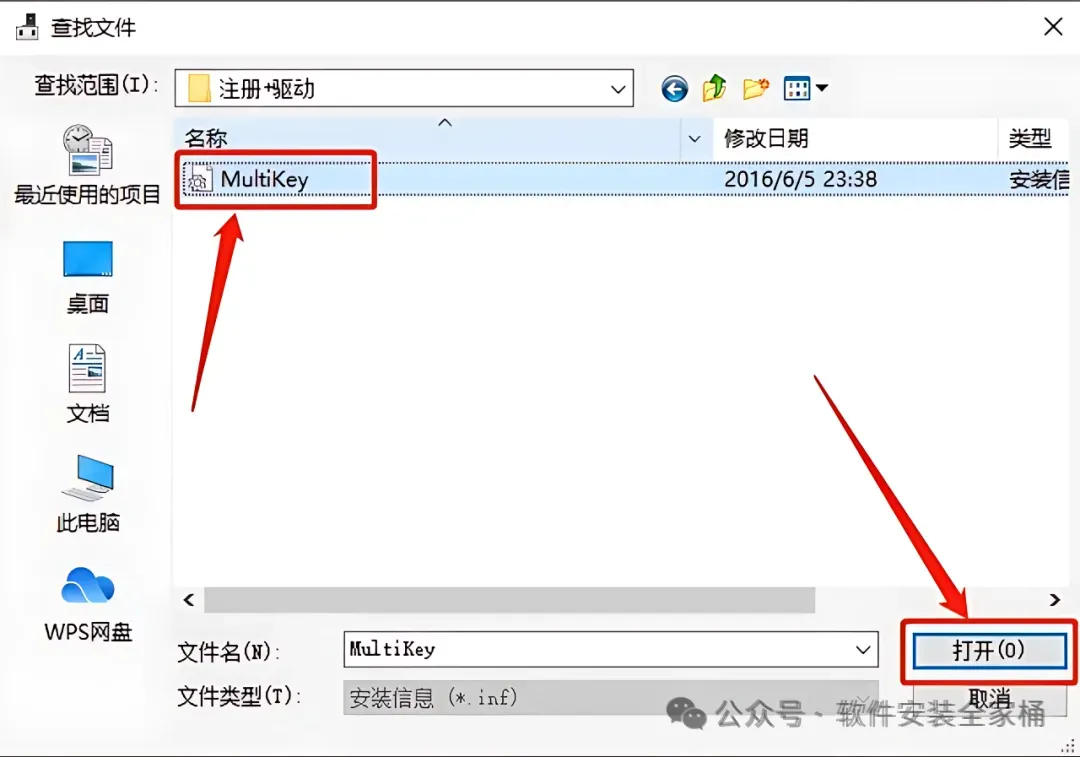 32.点击【浏览】,接下来需要找到并打开安装包中的【MultiKey.inf】文件。