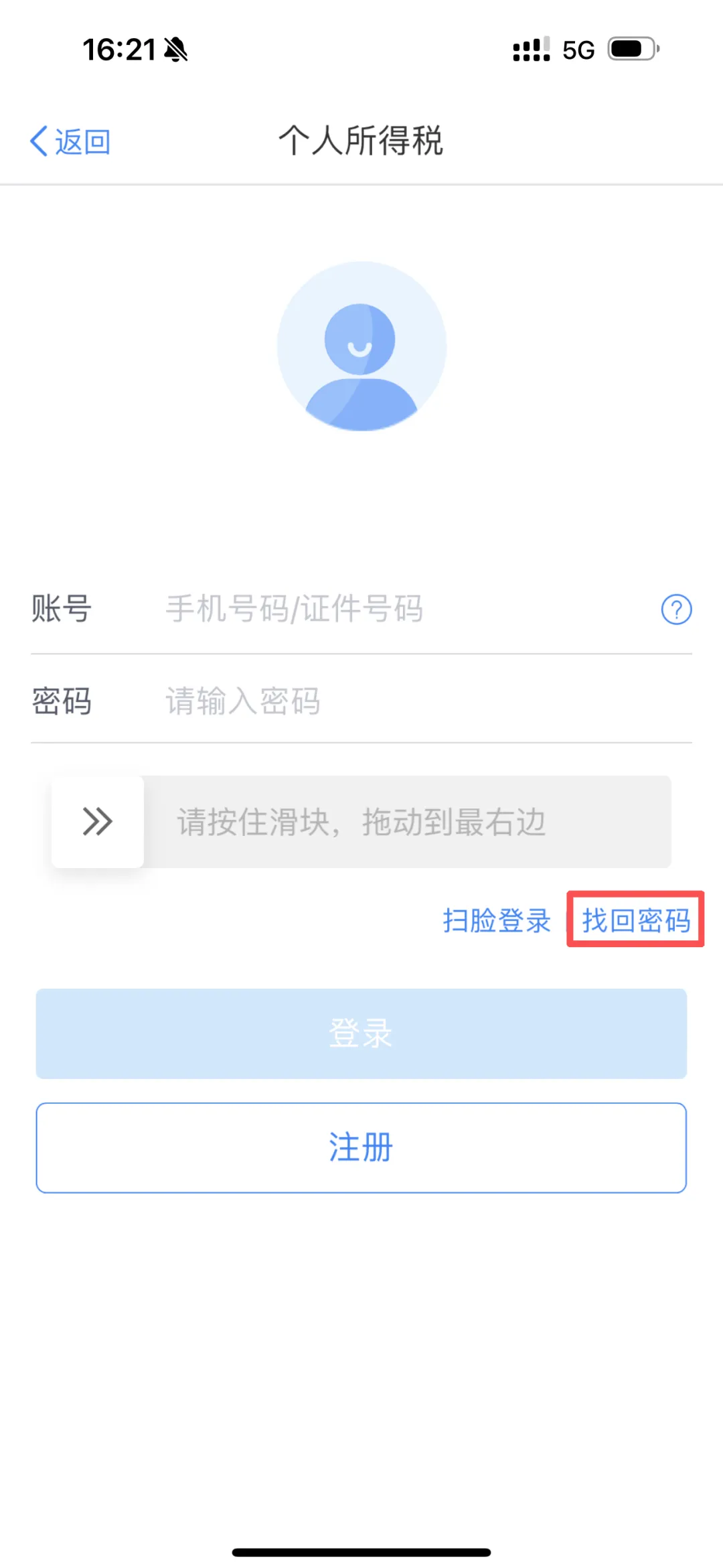 1. 打开个人所得税APP,在登录界面点击 【找回密码】。