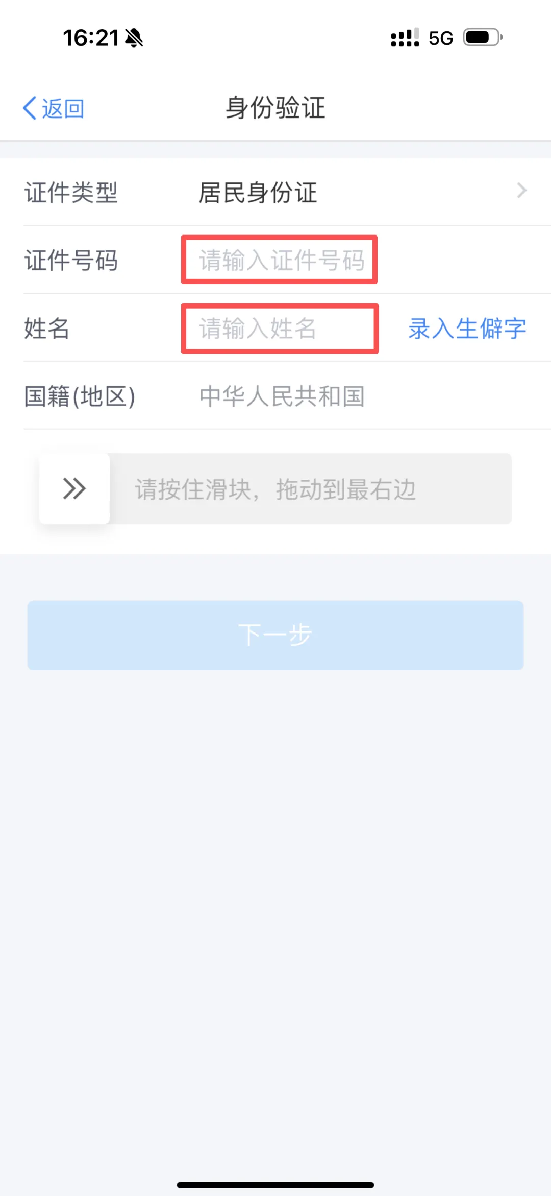 2. 准确输入本人姓名、身份证号码,完成滑块验证。