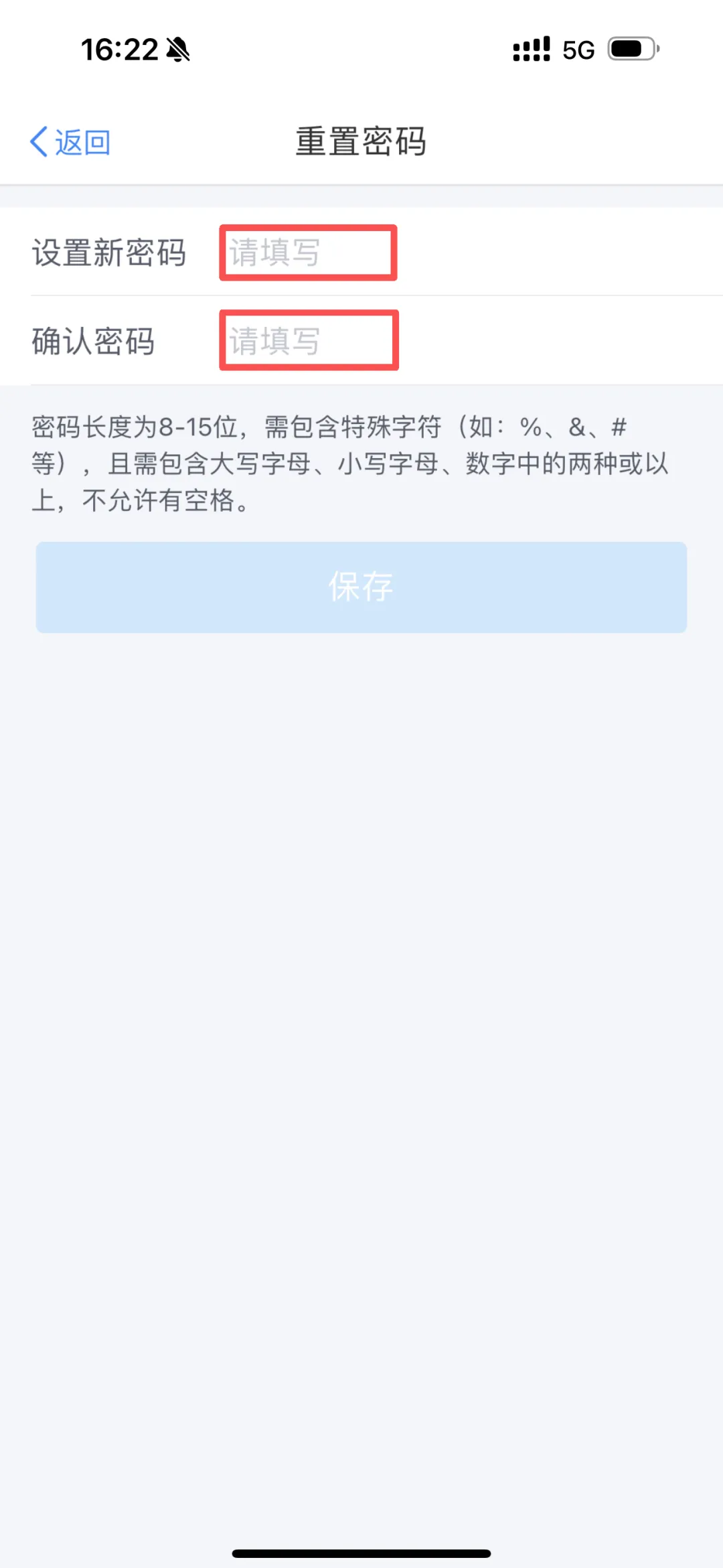 要求:密码长度8-15位,需包含特殊字符(如:%、&、#等),且需包含大写字母、小写字母、数字中的两种或以上,不允许有空格。