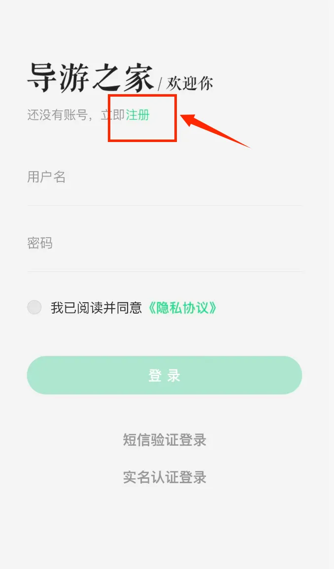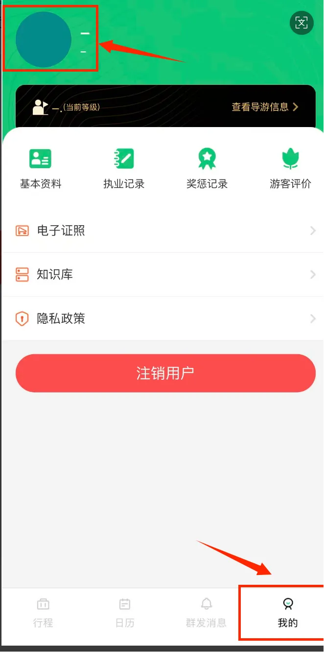 ① 打开「全国导游之家」APP,点击底部【我的】,再点击左上角头像区域,进入【注册/登录】页面。