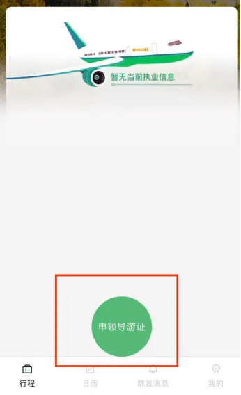 ① 点击APP内点击【行程】-【申领导游证】按钮,进入申请页面,依次完成3个环节:【资格验证】→【填写信息】→【上传照片】。