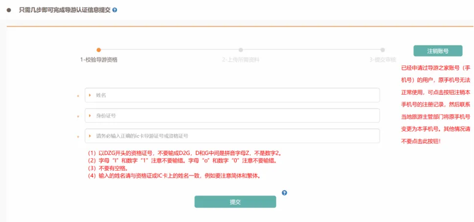 ① 导游资格校验:准确填写导游资格证编号,核对个人基础信息,确保与资格证一致。