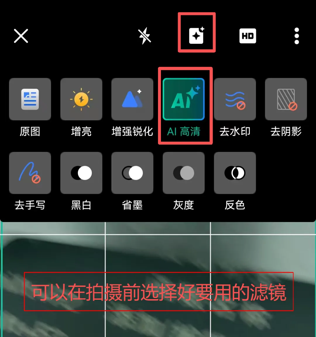 连拍所需文档,注意不要有光斑,选择“AI高清”滤镜,设图片方向。
