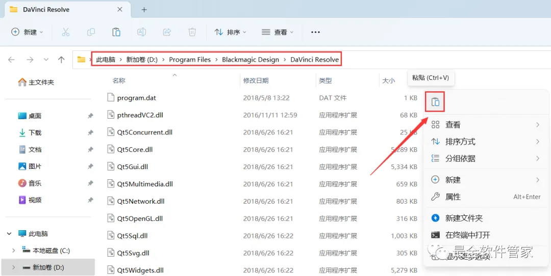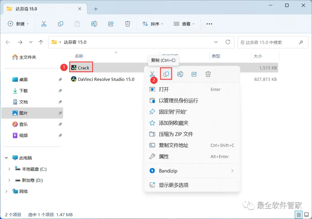 11、回到达芬奇 15.0文件夹,找到【Crack】程序,右键点击【复制按钮】