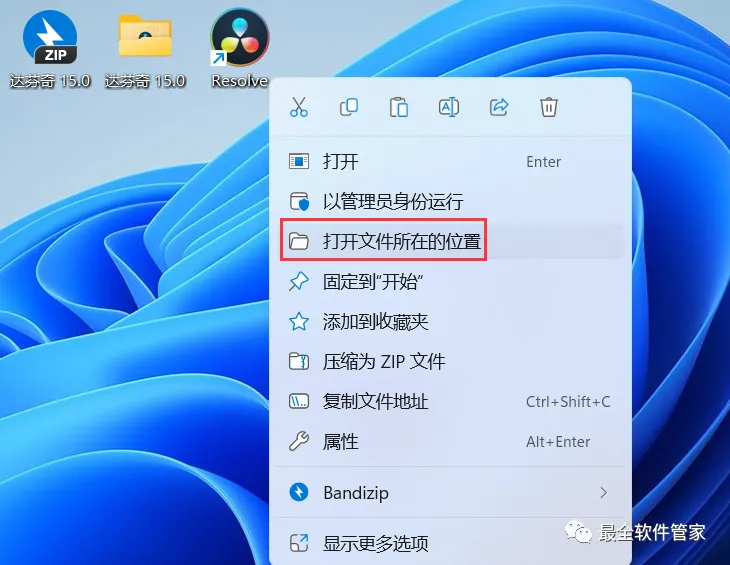 12、回到桌面,右键桌面上的【DaVinci Resolve软件图标】,点击【打开文件所在的位置】
