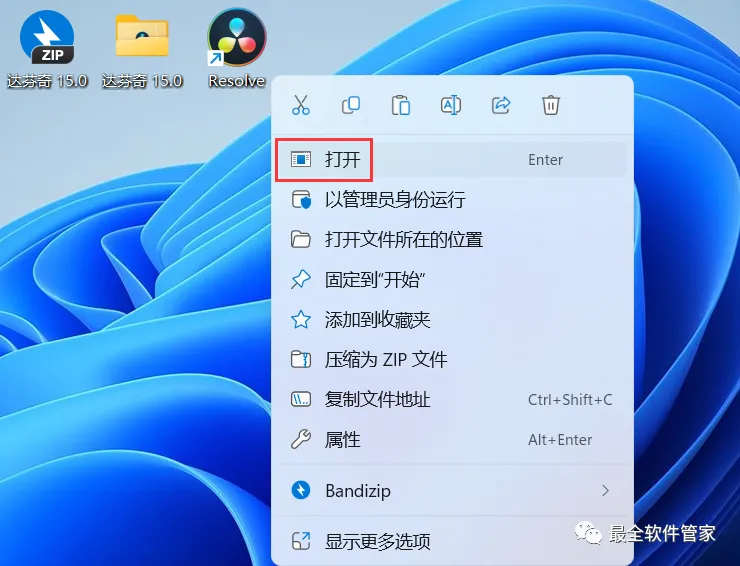 17、回到桌面,右键桌面上的【DaVinci Resolve软件图标】,点击【打开】