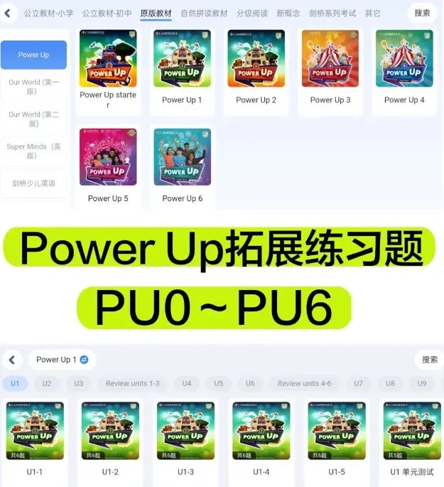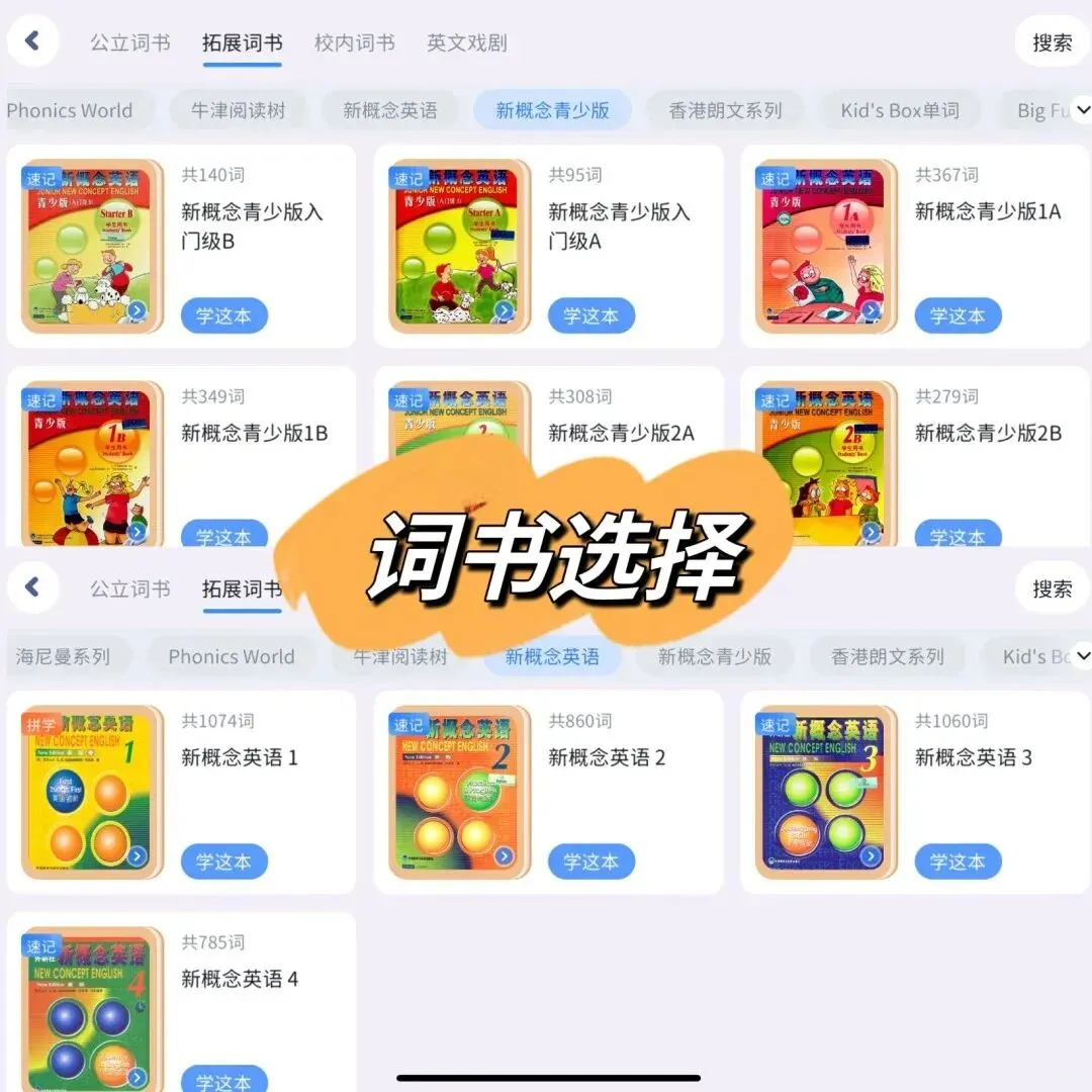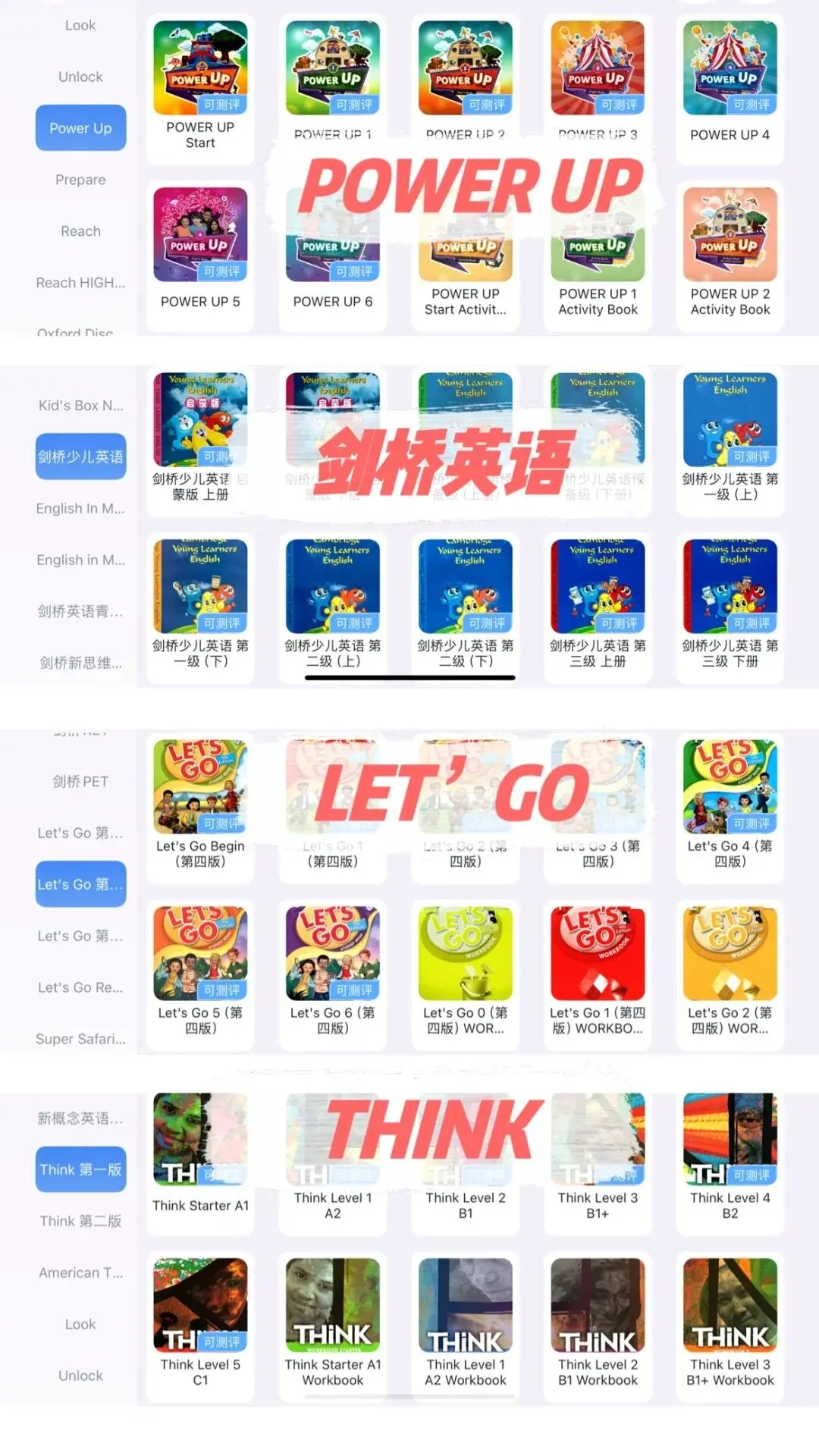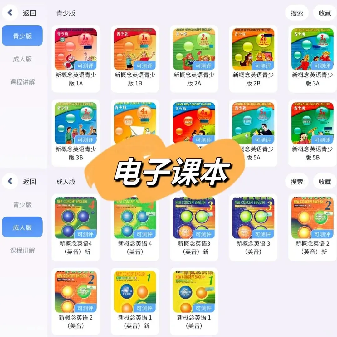 不管是新概念成人版、青少版,还是Power Up、Oxford Discover、Think等热门原版教材——**全部都有配套电子课本+音频+练习+单词闯关**,一套流程安排得明明白白!