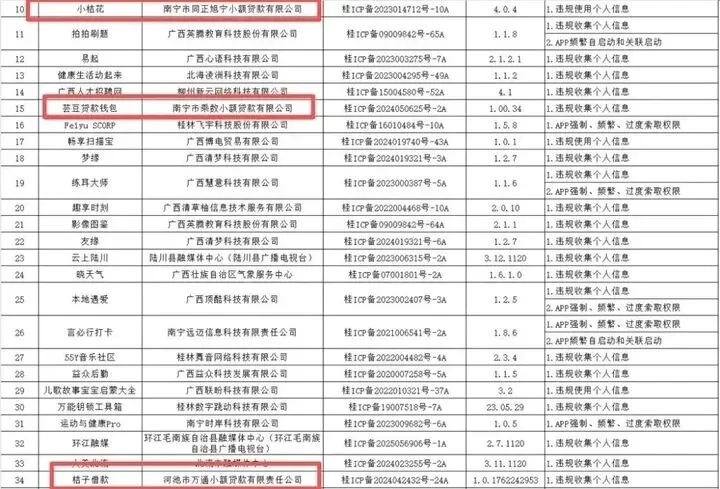 最近广西通信管理局点名了40款App,其中三家小贷公司赫然在列。南宁同正旭宁小贷的“小桔花”,南宁乘数小贷的“芸豆贷款钱包”,河池万通小贷的“桔子借款”。侵害用户权益,限期五个工作日整改,逾期下架关停。