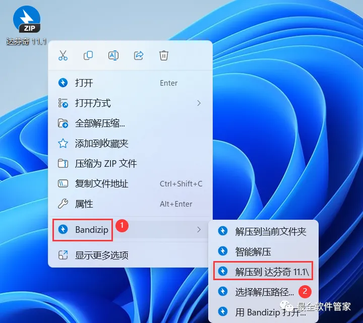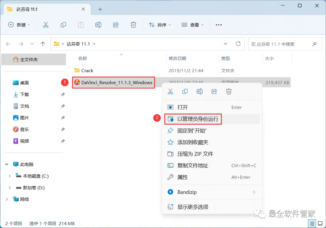1、下载达芬奇 11.1软件安装包到电脑上,右键选择【解压到达芬奇11.1\】