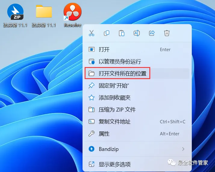 19、回到桌面,右键桌面上的【DaVinci Resolve软件图标】,点击【打开文件所在的位置】