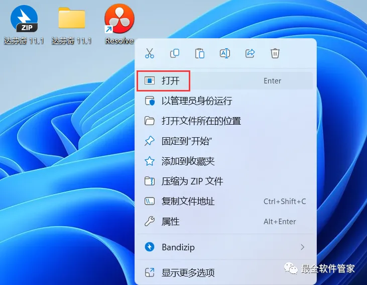 22、回到桌面,右键桌面上的【DaVinci Resolve软件图标】,点击【打开】