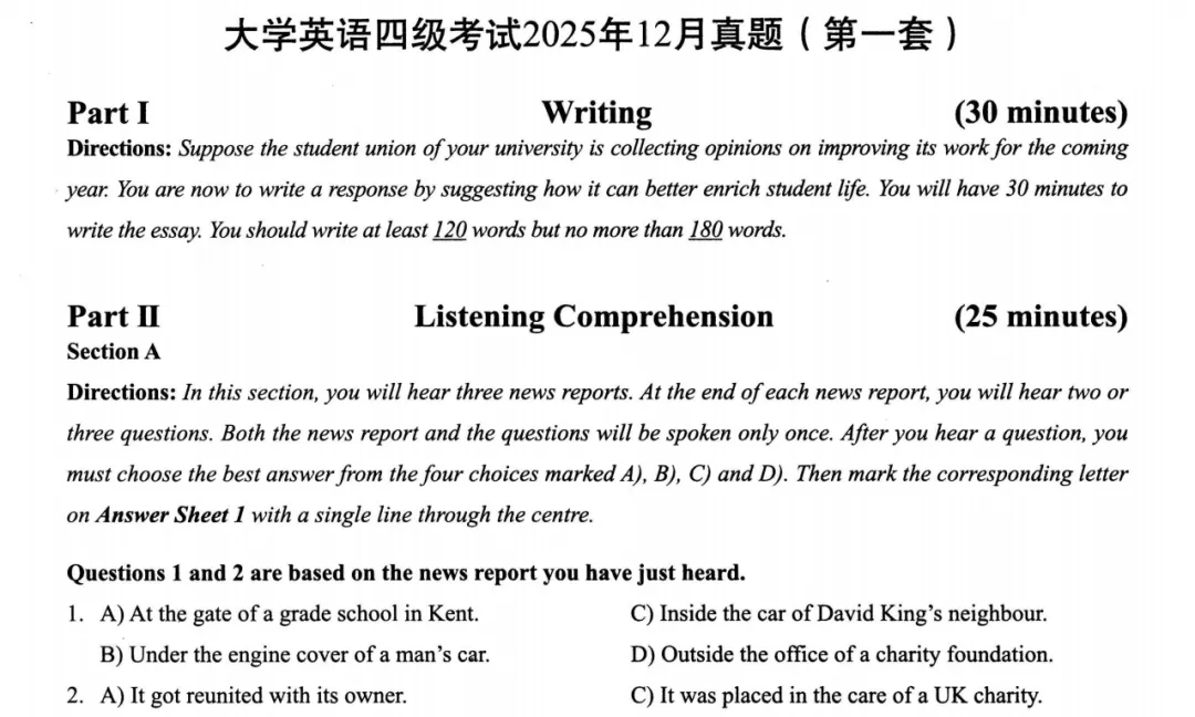 2025年12月大学英语四级真题及答案PDF电子版(三套全)