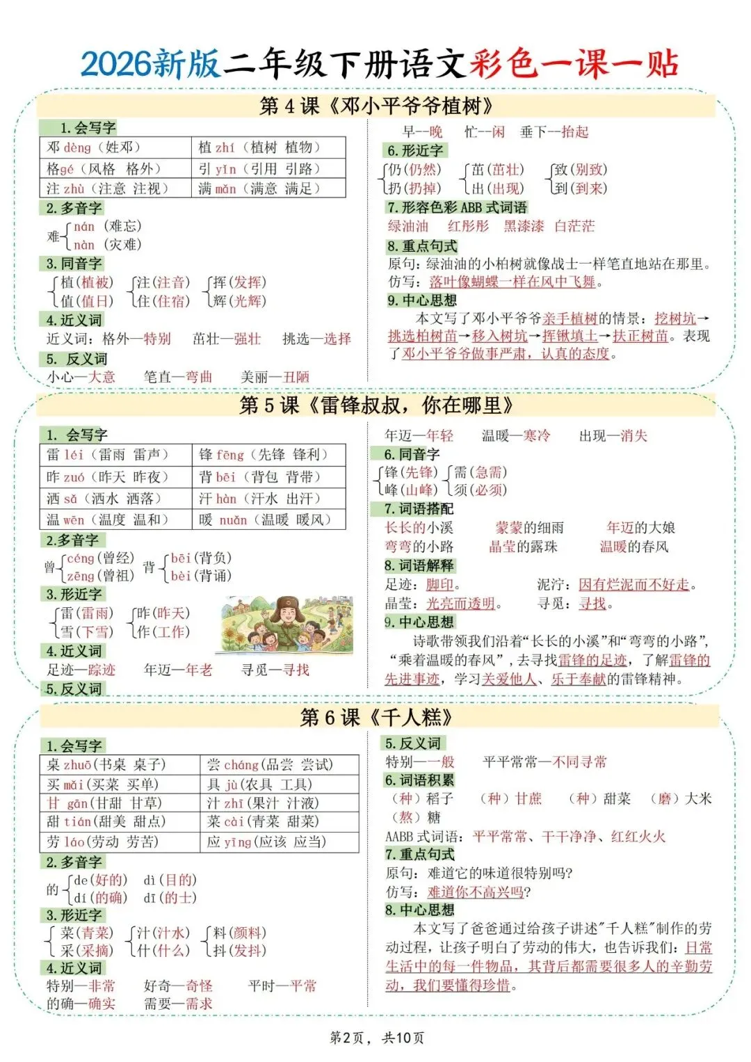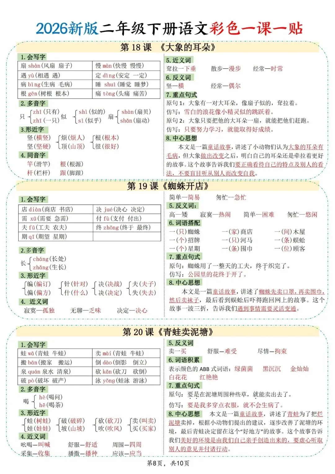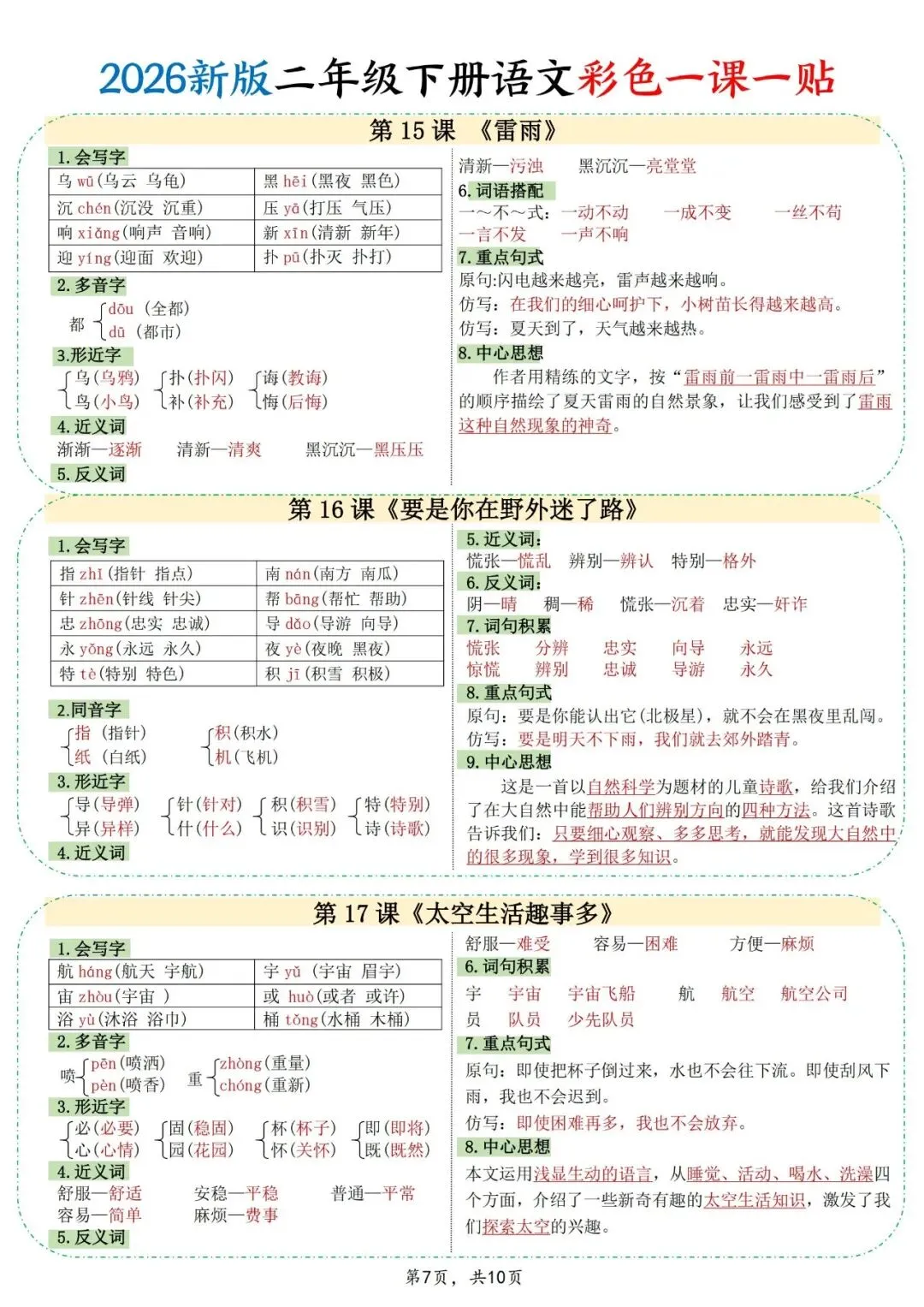 想让孩子抓住二年级下册语文课文重点,这份资料一定要收好。2026版语文一课一贴,把每篇课文的字词、句式、中心思想都梳理得很清楚,孩子不用再自己慢慢找。可打印PDF一共10页,粘贴在课本上,平时翻看就能巩固知识,学习更轻松。