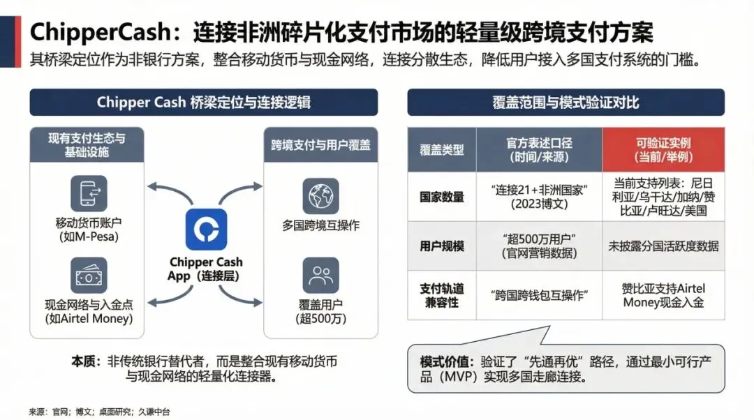 这种模式的价值在于,它大幅降低了普通人使用多国支付系统的门槛。相比自建一套完整的银行体系,Chipper Cash选择了一条更轻的道路:整合各国现有的移动货币账户,比如肯尼亚的M-Pesa,以及成熟的现金代理网络。它在2018年刚成立时,产品只打通了少数几个国家间的转账通道,验证了先连接、再优化的发展路径。