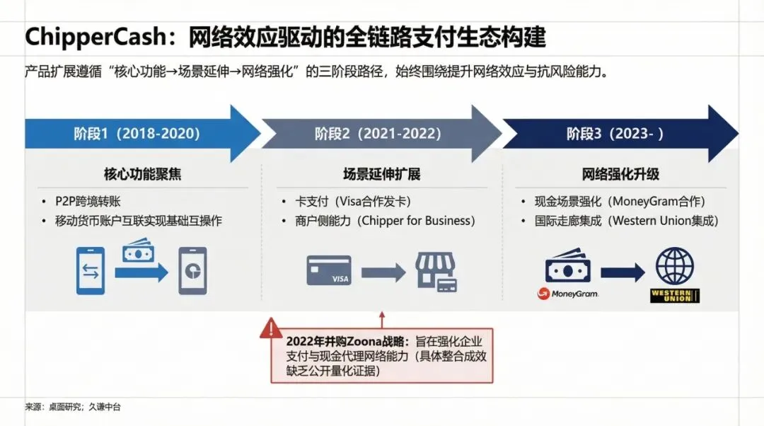 Chipper Cash的产品扩张路径清晰,分为三个阶段,核心目标是不断增强网络效应,提高抗风险能力。