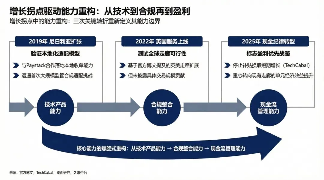 回顾其发展历程,Chipper Cash的核心能力经历了三次重构。2019年进入尼日利亚市场,完成了从纯技术产品到本地化合规能力的构建。2022年上线英国服务,是其测试全球汇款走廊可行性的尝试。而2025年计划停止补贴,则标志着公司的核心能力必须从合规整合,再次进化到精细化的现金流管理和盈利能力。