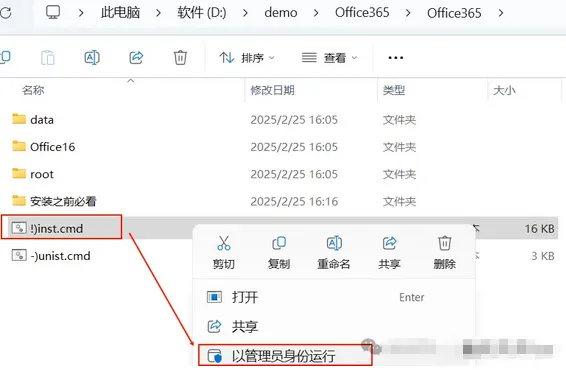 1.将下载好的压缩包解压,然后选中“❗)inst.cmd”鼠标右键以管理员身份运行。