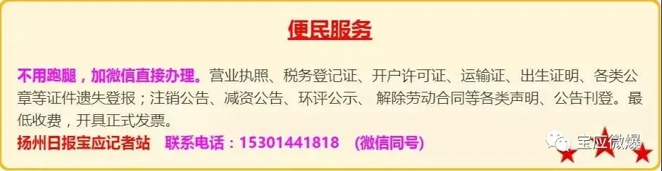 特别声明:为响应国家保护知识产权的号召,【宝应报广信息】对所发文字稿件及图片特声明如下:一、知道稿件及图片来源的,我们会注明稿件及图片的出处或作者,请作者联系小编,我们将按照【宝应报广信息】稿费标准,发放稿费。二、对于图片和稿件未提及出处的,我们转发时未能及时署名的,请原作者或单位联系我们,我们将按照【宝应报广信息】稿费标准,及时发放稿费。三、对于不同意使用的稿件和图片,请原作者或有关单位及时联系我们,我们立即删除,以防侵权。四、2024年12月以前的稿件或图片,因条件所限,未能署名的,请作者或者单位联系我们,我们将按照上述标准发放稿费或及时删除。