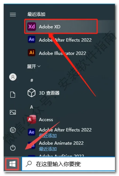 6.在桌面左下角的开始菜单中找到”Adobe XD“软件,鼠标左键拖拽到桌面上即可创建桌面快捷方式