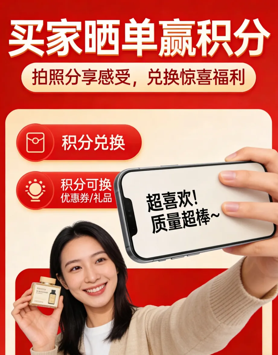 买家晒单简单,拍图说句真实感受即可,还能通过签到、发帖等赚积分,兑换优惠券等福利,晒单有回报。