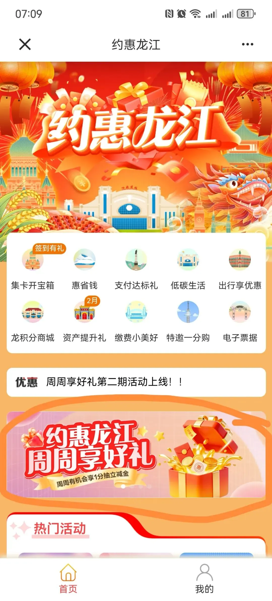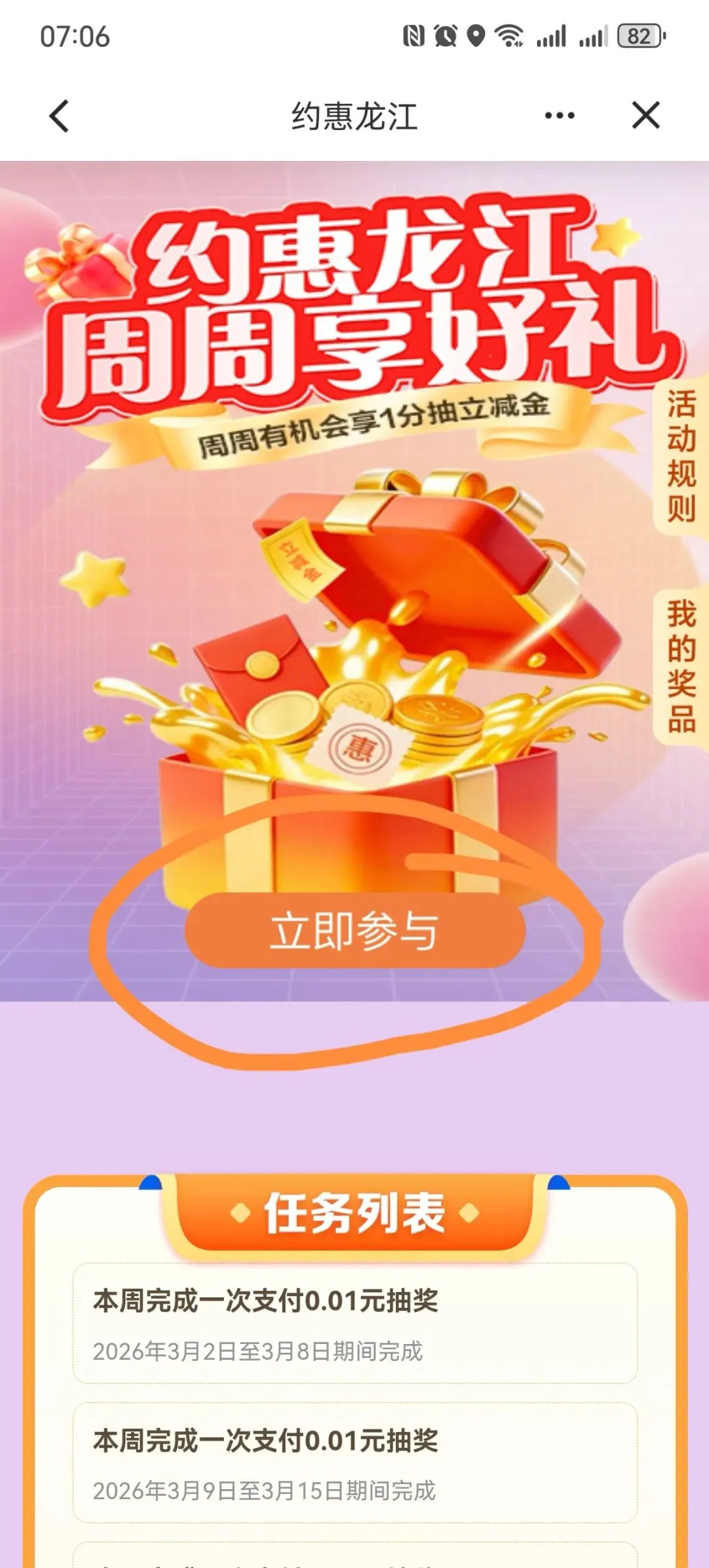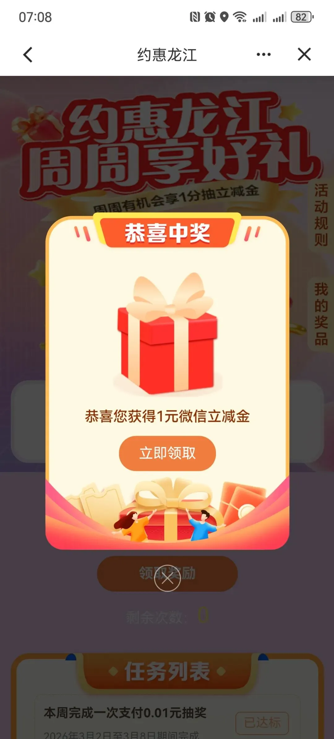 建设银行APP约惠龙江,周周享好礼,支付1分钱,抽微信立减金