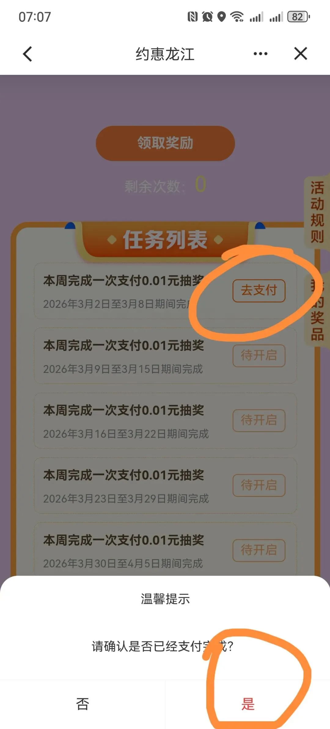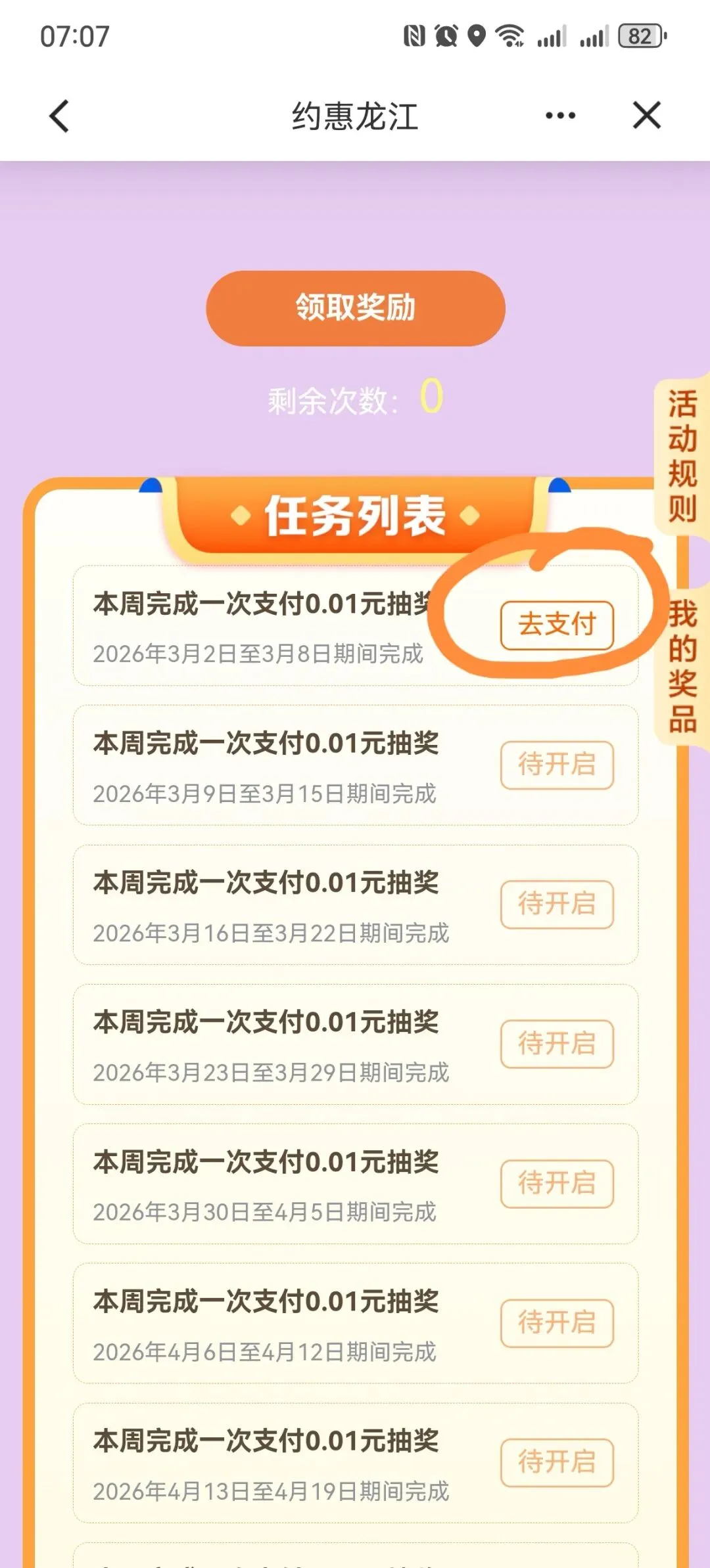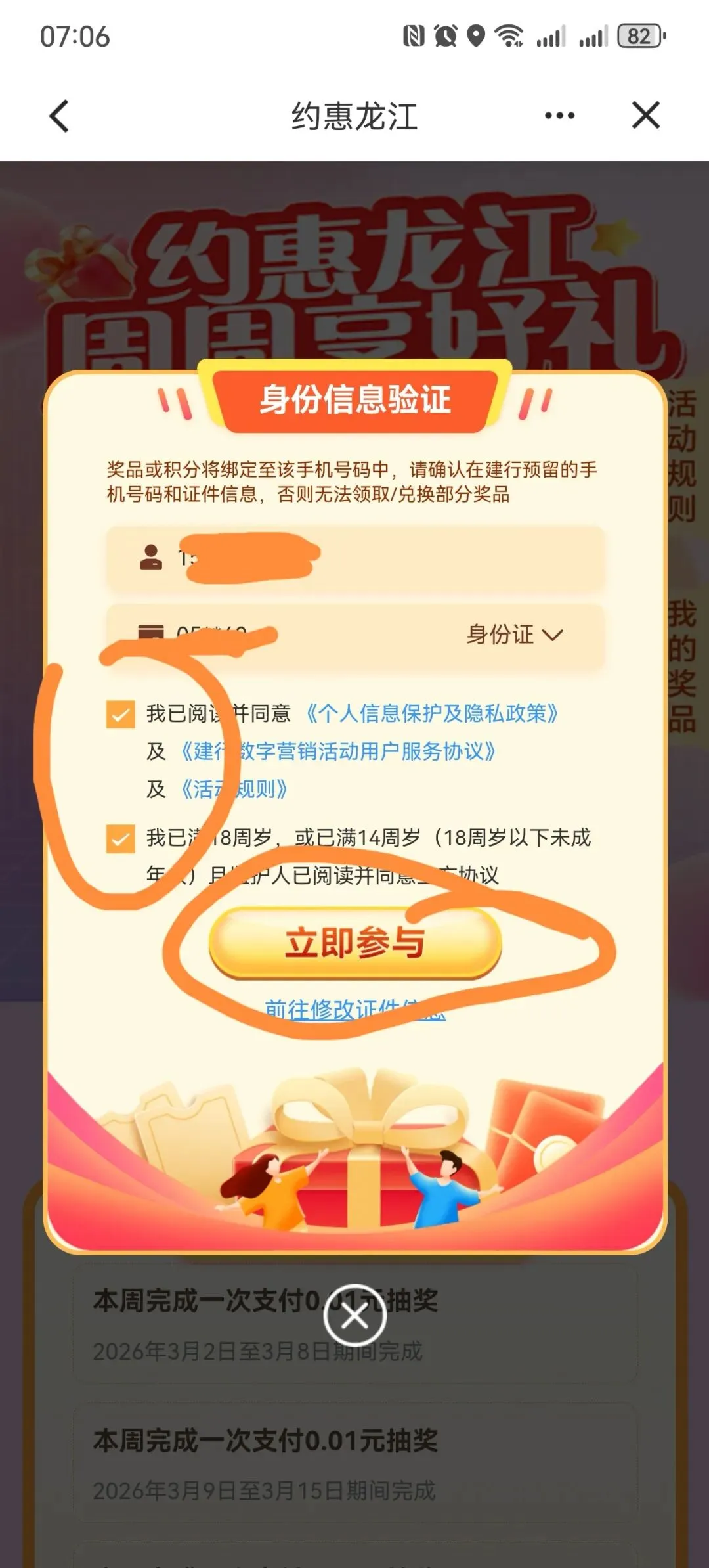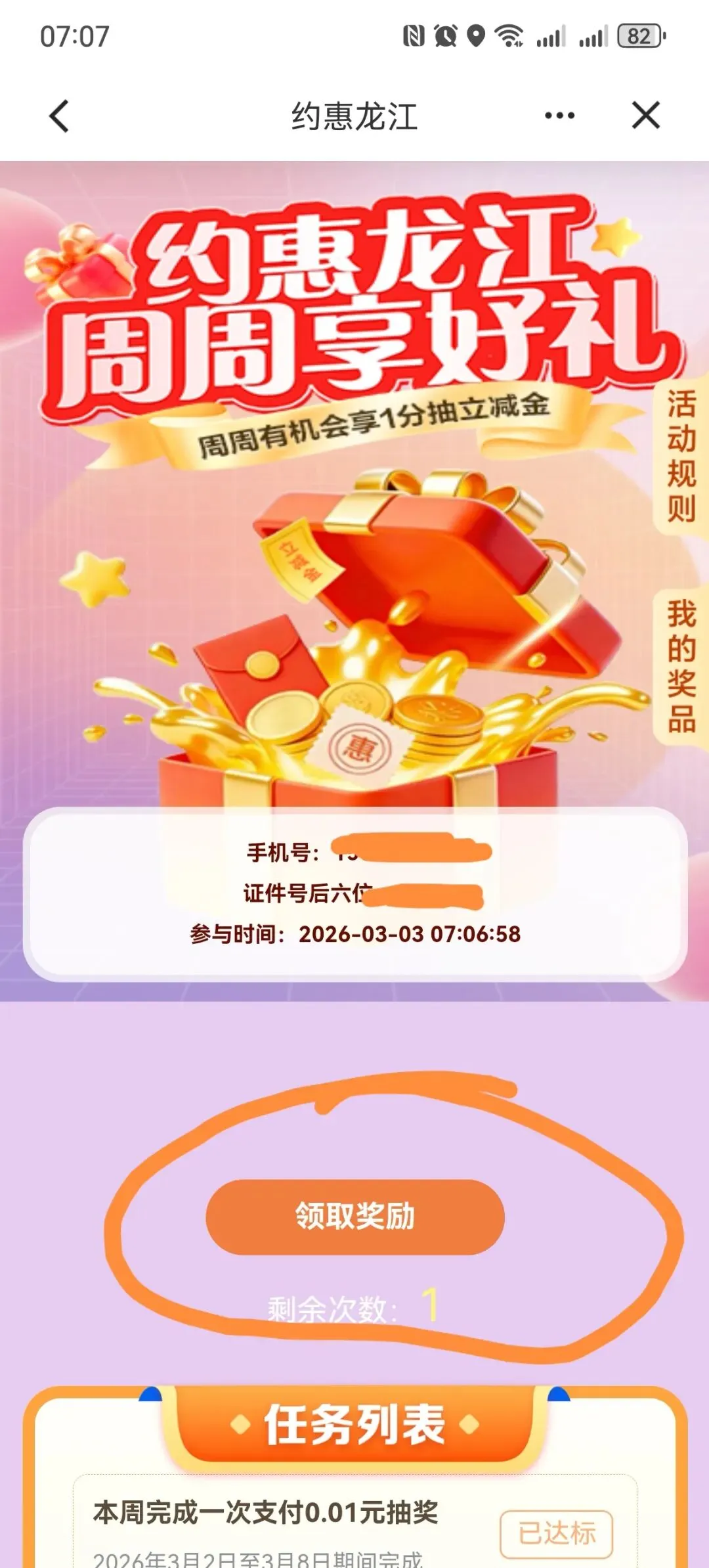建设银行APP约惠龙江,周周享好礼,支付1分钱,抽微信立减金