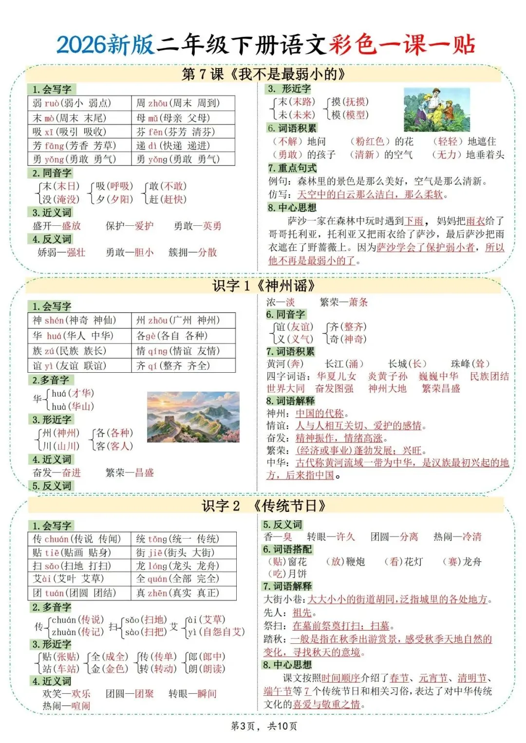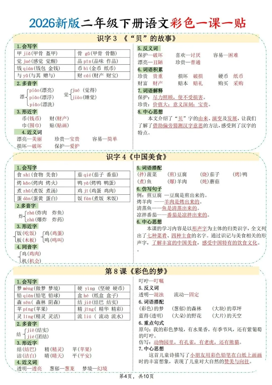二年级语文学习,打好基础特别关键,这份26新彩色课课贴就很适合用来夯实基础。里面涵盖了会写字、多音字、同音字、近反义词等基础知识点,还有重点句式和中心思想。可打印电子版10页,家长帮孩子打印粘贴,日常积累语文知识,成绩稳步提升。