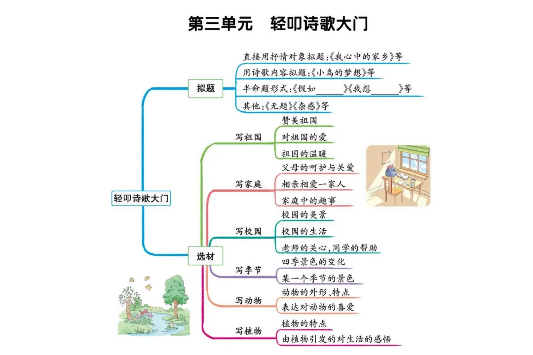 今天为大家分享:写作是语文学习的核心能力,而清晰的写作框架则是攻克习作难关的关键钥匙。小学语文单元写作思维导图,精准聚焦 “轻叩诗歌大门”“我的动物朋友” 等高频单元主题,将写作流程拆解为 “审题 — 选材 — 构思” 三大核心步骤,让每一类习作都有明确的创作路径。