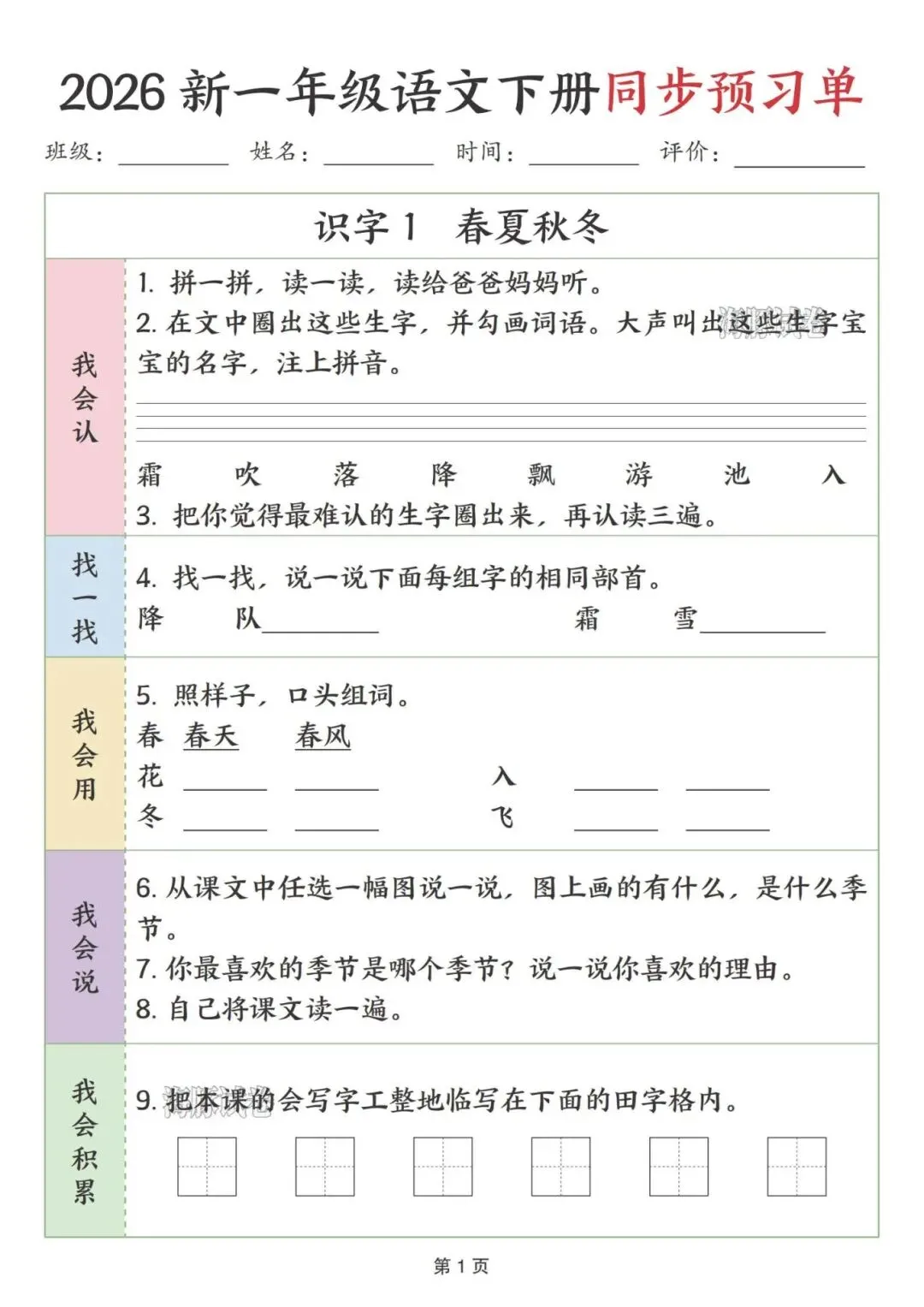 26春一年级下册《语文同步练习单》电子版可打印