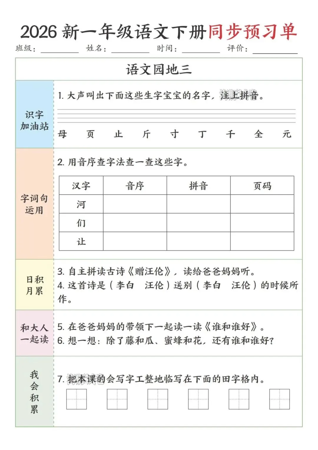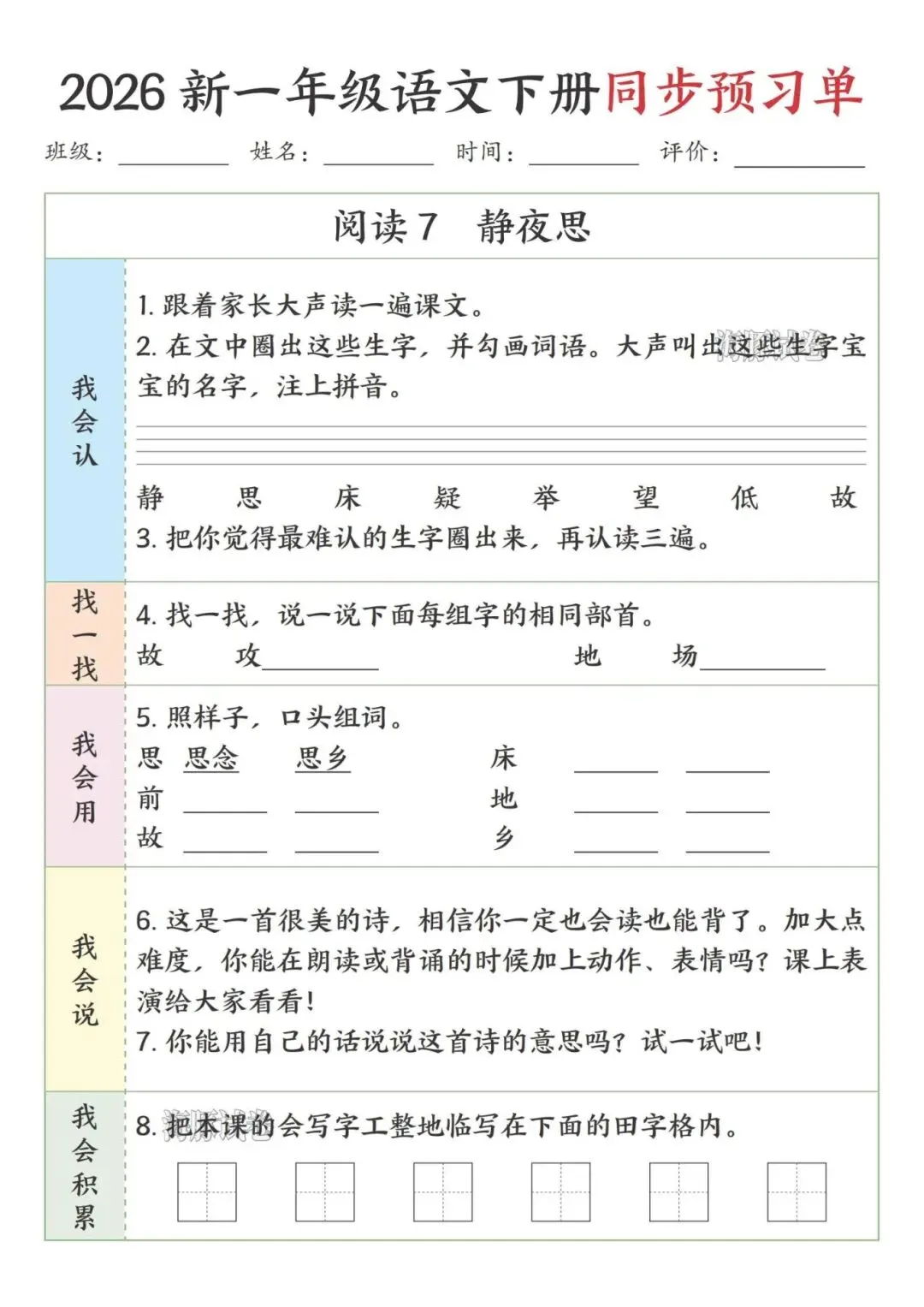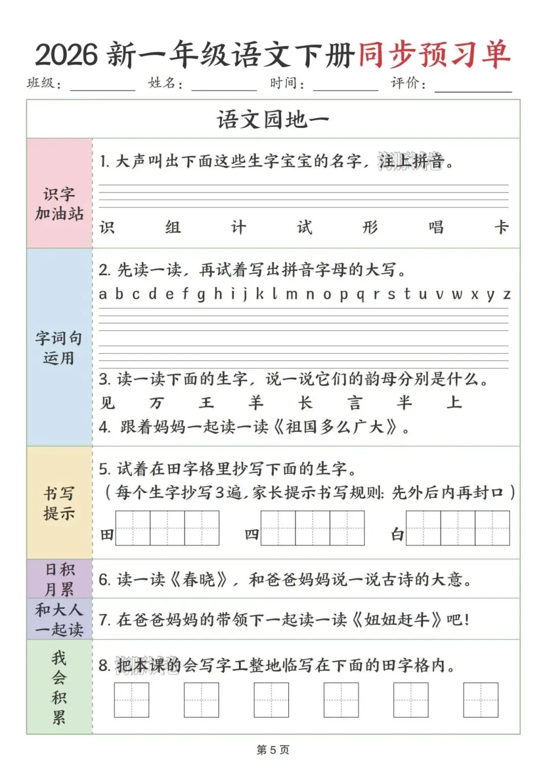 这份一年级下册语文预习单完全贴合课本课文顺序,按识字、阅读、语文园地依次编排,特别适合课前预习。每课都分了我会认、找一找、我会用等板块,步骤简单清晰,低年级孩子能跟着一步步做,还侧重亲子互动,让家长轻松辅导。既抓生字、部首、组词这些基础,又有口头表达、书写积累的练习,能全方位帮孩子打牢语文基础,预习起来特别顺手。