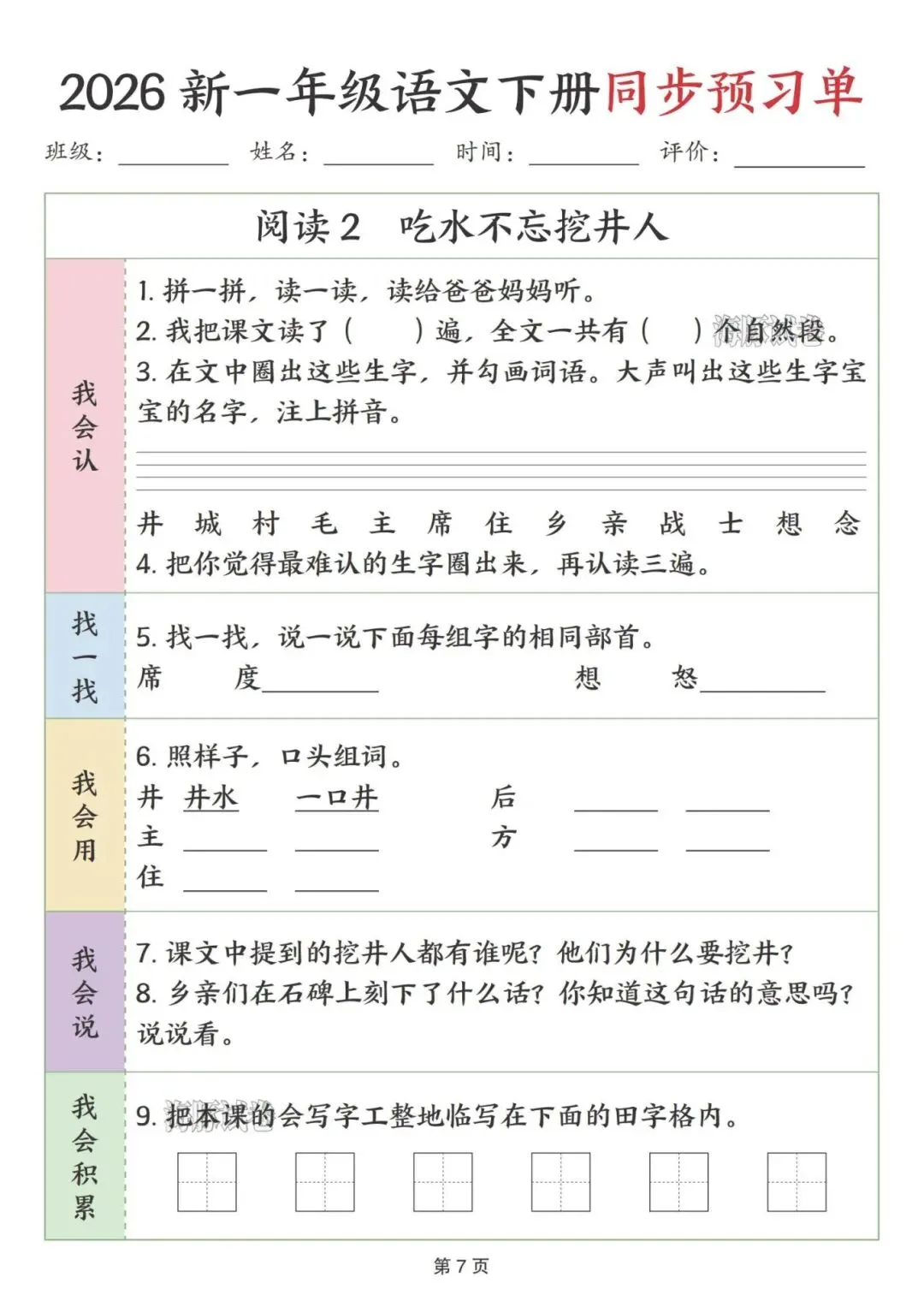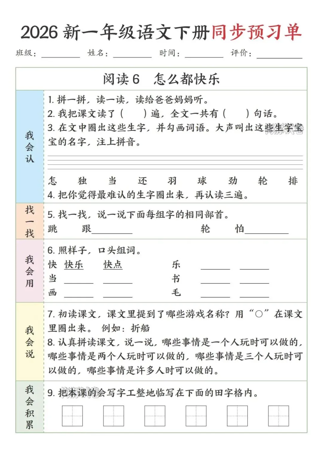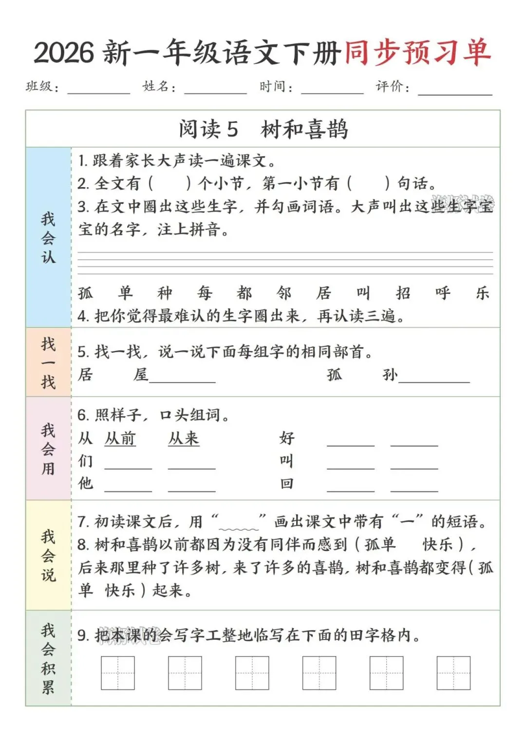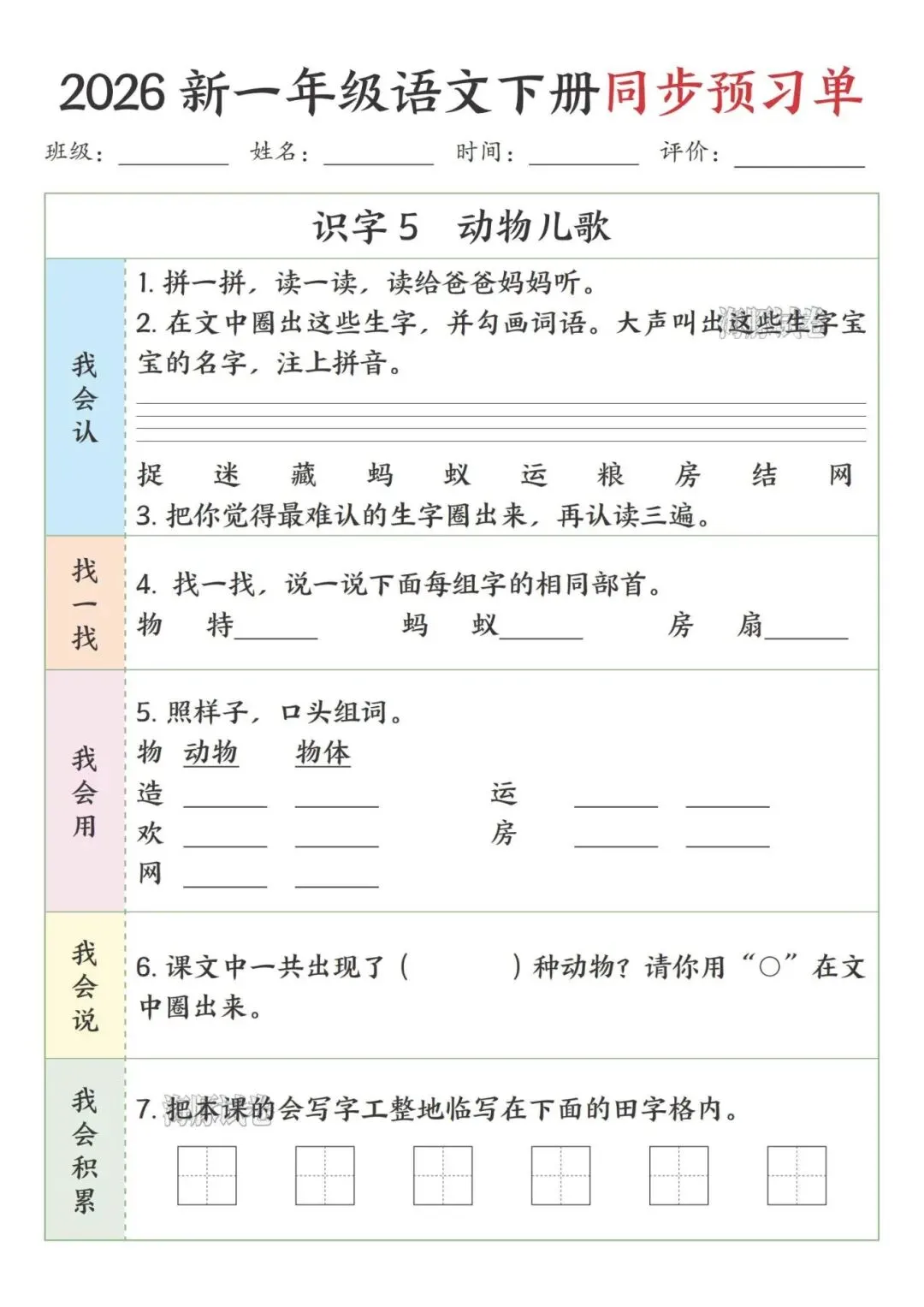 这份一年级下册语文预习单完全贴合课本课文顺序,按识字、阅读、语文园地依次编排,特别适合课前预习。每课都分了我会认、找一找、我会用等板块,步骤简单清晰,低年级孩子能跟着一步步做,还侧重亲子互动,让家长轻松辅导。既抓生字、部首、组词这些基础,又有口头表达、书写积累的练习,能全方位帮孩子打牢语文基础,预习起来特别顺手。
