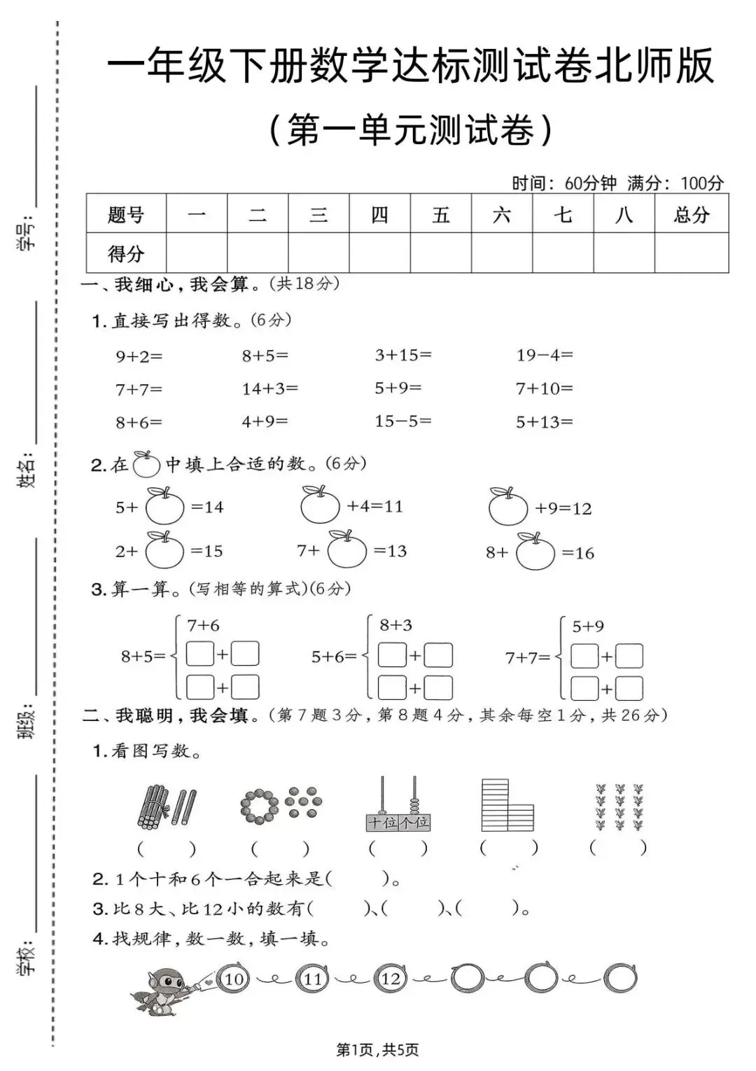 26春一年级下册数学第一单元测试卷(北师版)100 以内加减法专项检测(可打印)