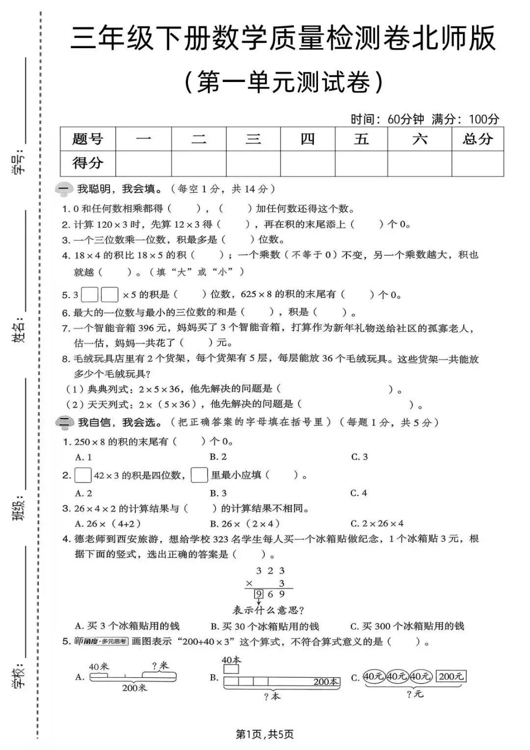三年级下册数学第一单元重点学习三位数乘一位数、乘法运算规律及应用!这份北师版三年级下册数学第一单元质量检测卷专为单元检测设计,题型涵盖填空、选择、计算、应用题,还附详细答案和解题思路,既能检验学习效果,又能针对性突破难点,打印出来让孩子限时练习,扎实掌握第一单元知识点~电子版打印即用~