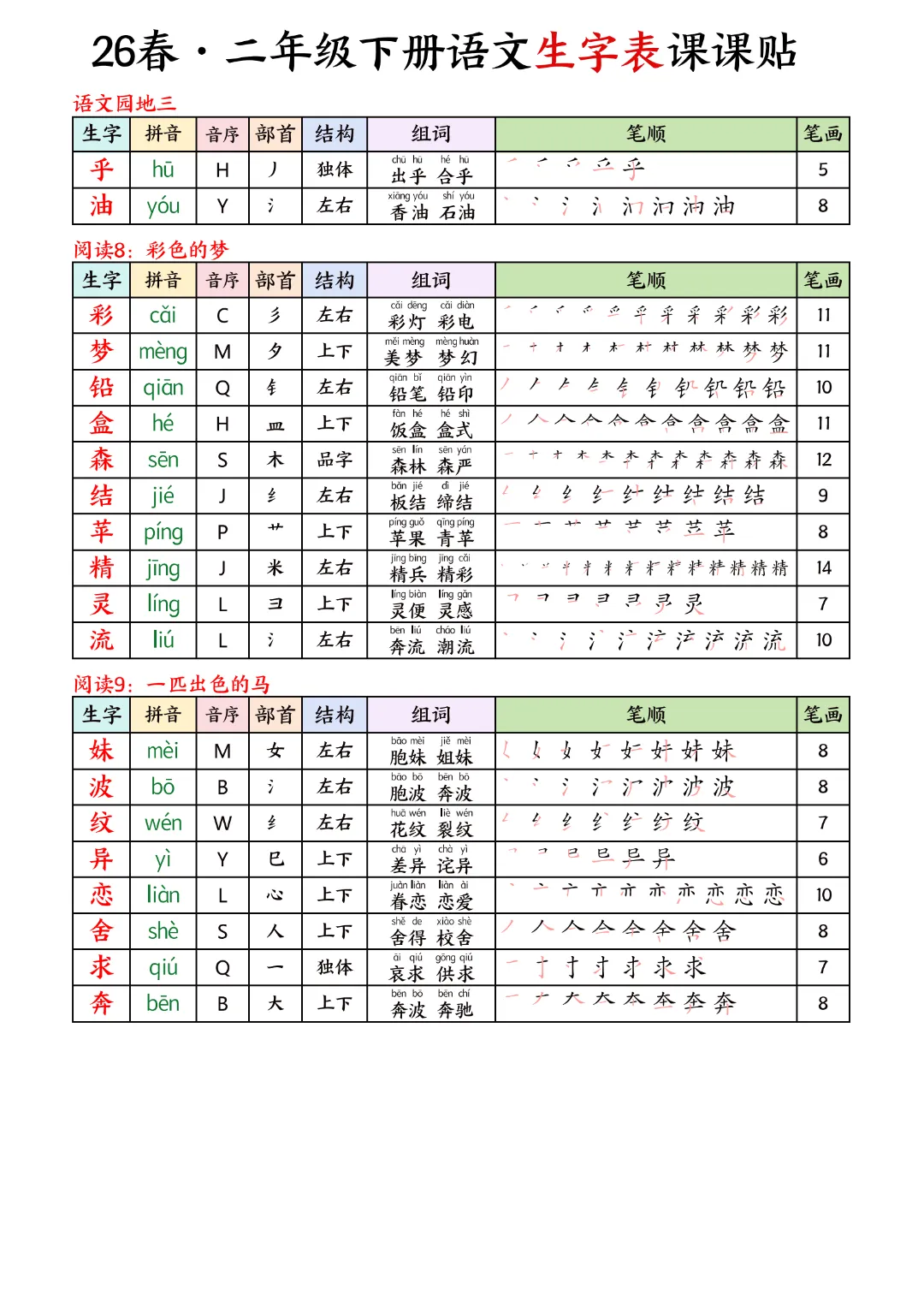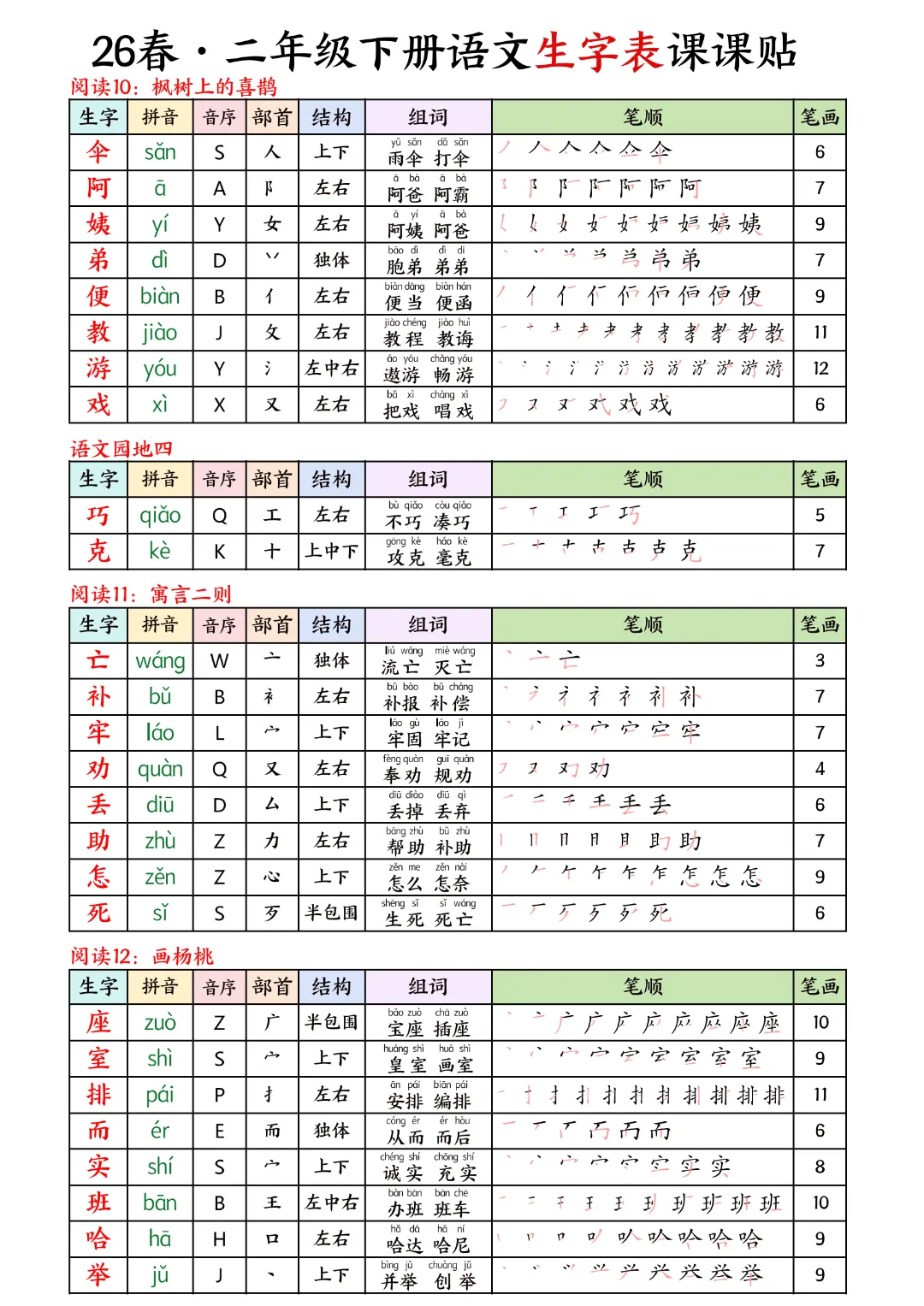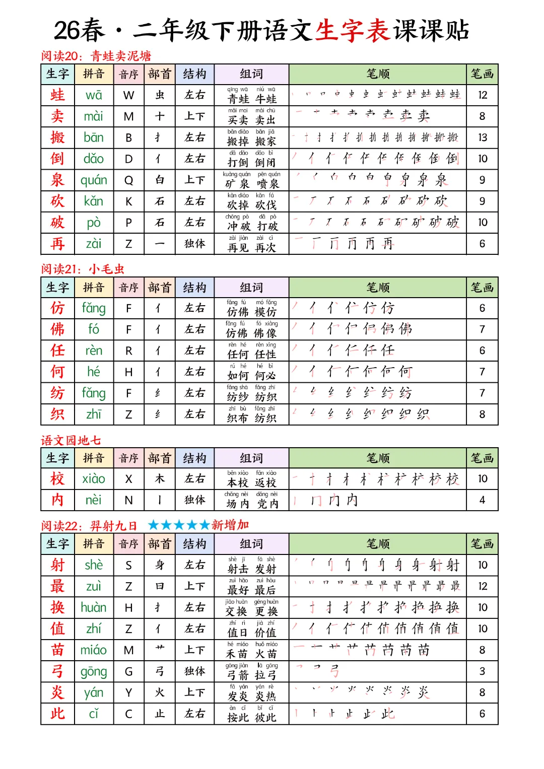 2026年春新版二年级下册语文人教部编版生字表课课贴,可电子版下载打印,助力新学期学习更高效,需要的家长可以打印出来,让孩子每天练一练!帮助孩子巩固基础,提升成绩!